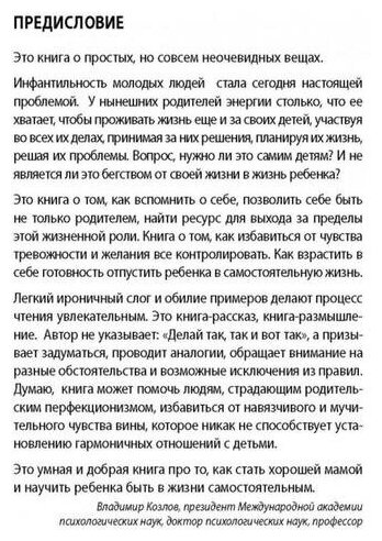 Отличная книга для всех, у кого в близком окружении и контакте есть дети, маленькие и подростки. Почему говорю "в окружении"? Потому что, конечно, в первую очередь материал ориентирован на мам, но пригодится всем, кто имеет отношение к процессу воспитания. Подробно, понятно, наглядно и последовательно автор рассказывает, как найти баланс между заботой, поддержкой, привязанностью, но при этом не ограничивать и не тормозить развитие ребёнка, задушив в нем инициативу и желание к чему-либо стремиться и изучать. Помимо этого затронуты вопросы, как установить равновесие между потребностями ребёнка и мамы без вреда для обоих