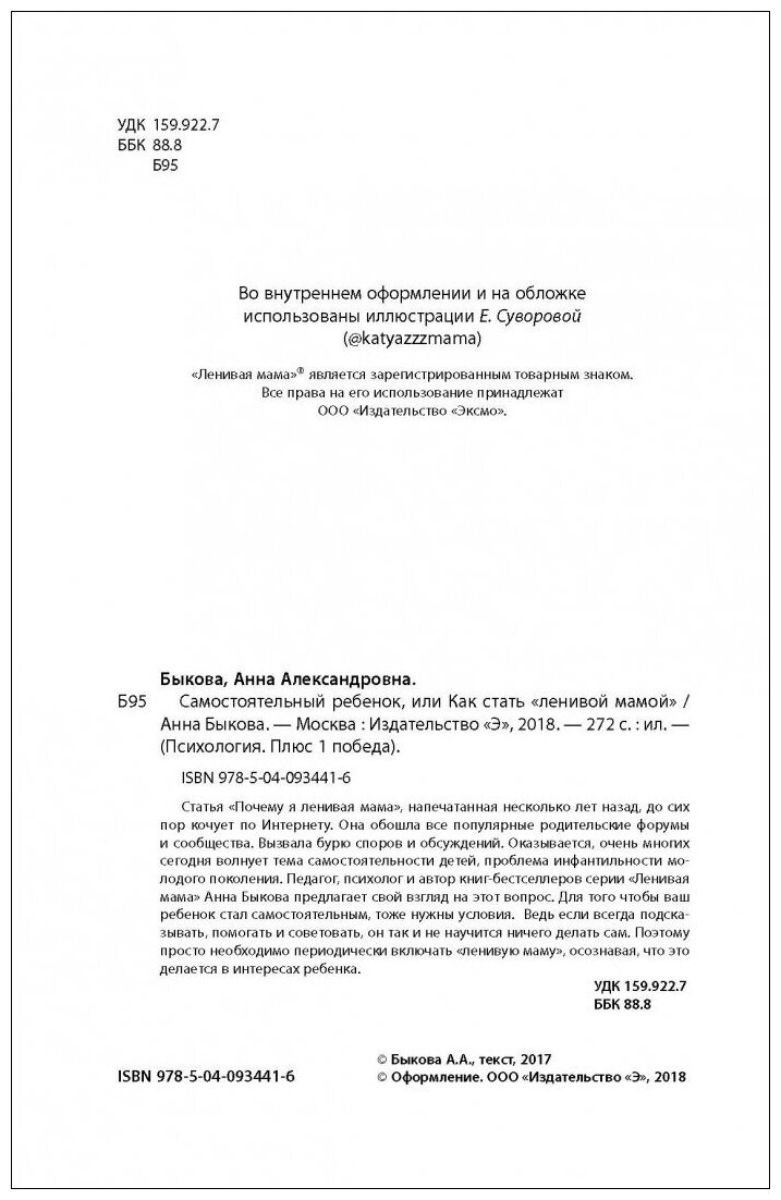 Книга просто класс! Читается на одном дыхании. Написана очень простым языком, с юмором. Отличное руководство к действию для всех родителей и тех, кто общается с детьми от малышового до подросткового возраста. Расписано все пошагово. И табличка развития новых самостоятельных умений очень интересная. Иллюстрации очень к месту. Понравился стиль автора. Буду ещё заказывать её книги.