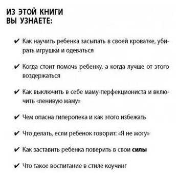 Потрясающая книга! Очень легко и быстро читается. Я рекомендую книгу всем родителям, быть то мама или папа. Очень много примеров из жизни, демонстрирующих неверное поведение общения с ребенком, а также много примеров как надо говорить с ребенком, чтобы стимулировать его развитие самостоятельности. Если у вас есть бабушка, которая вечно лезит помогать ребенку есть, ходить в туалет и вообще слишком переживает за него на улице и дома, то обязательно купите ей эту книгу!