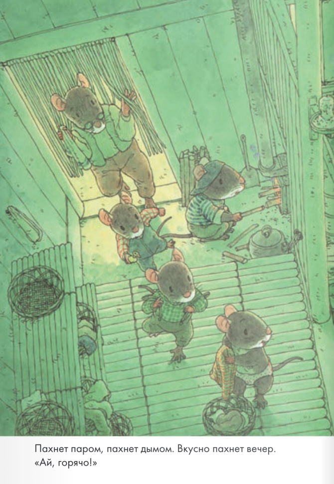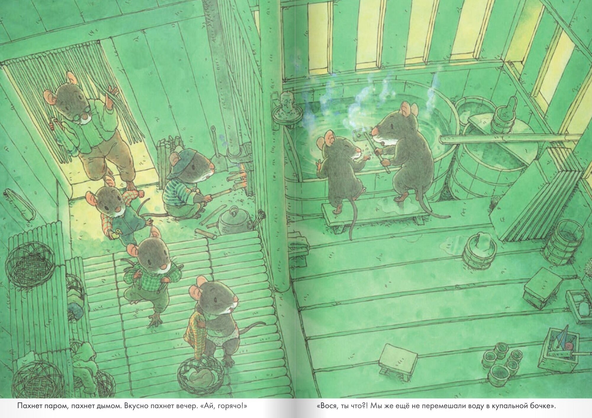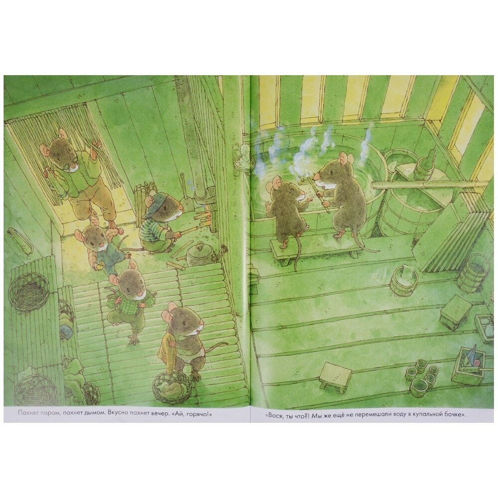 Сюжет книги: вечер, все мышата заканчивают свои дела по дому. Показано, как устроены у мышат баня, умывальники и туалет. Мышата купаются, ужинают и готовятся ко сну. Мама и бабушка поют по очереди мышатам колыбельную, которую когда-то слушал и папа.