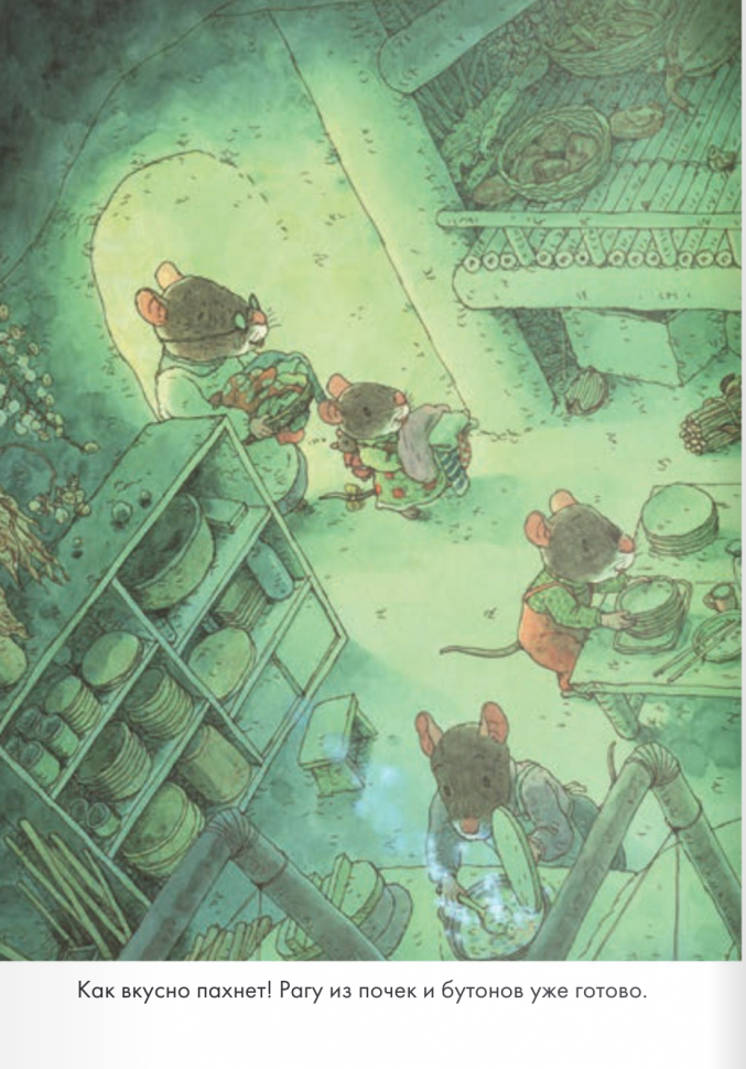 На втором развороте - обратите внимание на связку побегов с молодыми почками, которые принесли папа/дедушка/Первыш. На ней сидят 2 жука. Эта парочка будет потом на каждом развороте, где изображена комната и спальни мышат.