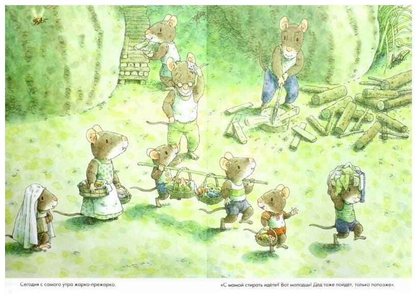В книге "14 лесных мышей. Стирка" в жаркий летний день семья отправляется к прохладному ручью с корзинками белья. Стирка превращается в настоящее приключение - с совместной командной работой, купаниями, даже героическими приключениями, ведь у речки быстрое течение и опасные водопады! А летний день наполнен красотой - стекают по листьям капли росы, звенят цикады, бегут по высокому небу пухлые облака. "Сохни, бельишко, в голубом небе. Сохни на зелёном ветру".