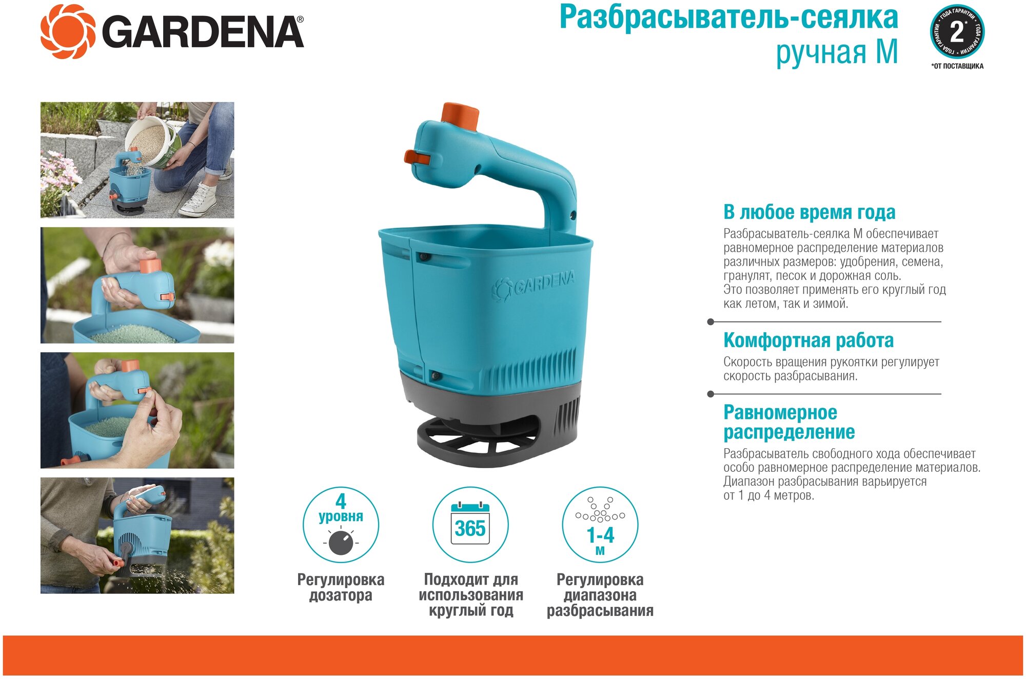 Ручная сеялка Gardena M предназначена для равномерного разбрасывания сыпучих материалов. Садовый инструмент можно использовать для посадки семян, посыпания дорожек солью или песком, внесения удобрений.