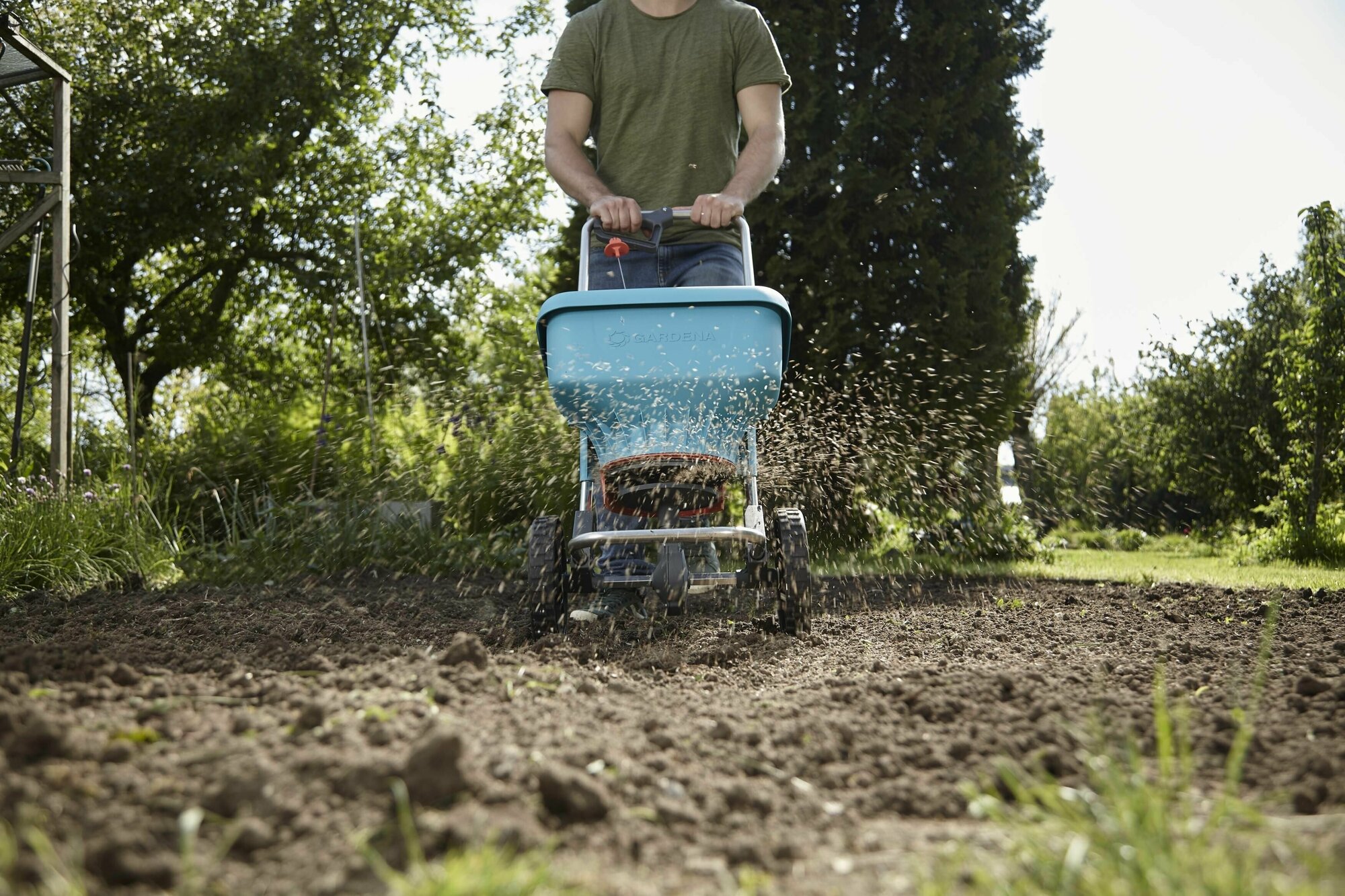 Ручная разбрасыватель-сеялка идеально подходит для распределения удобрений, семян и технической соли на больших участках. Вращающийся ротор обеспечивает оптимальную функциональность и равномерное разбрасывание материала. Расход материала регулируется непосредственно на эргономичной рукоятке. Поворотная крышка позволяет точно распределять метариал вдоль кромок газона или дорожек и защищает пользователя от травм. Разбрасыватель-сеялка изготовлена из материала, устойчивого к коррозии и воздействию неблагоприятных погодных условий, и легко моется струей воды.