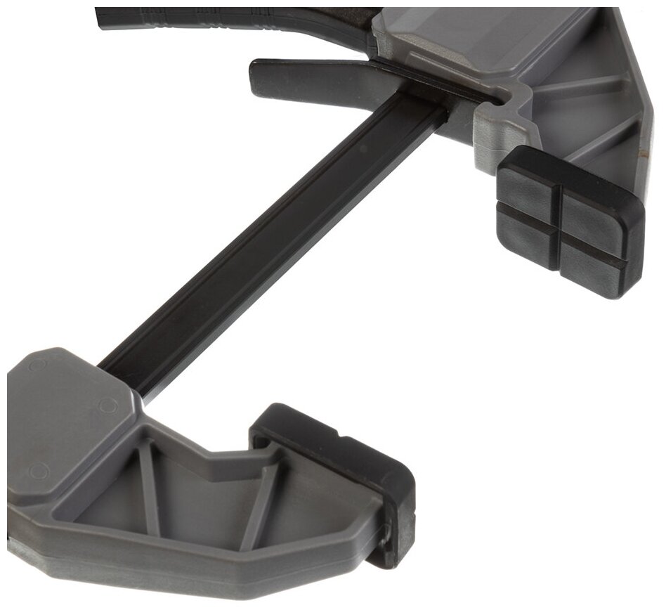 Прочие особенности и свойства | Усилие сжатия -135 кг. Переставная губка, освобождается при нажатии на кнопку. Съемные накладки на губках с канавками для удобства фиксации округлых деталей. Шина двутаврого сечения из холоднокатной стали. Корпус из армированной стекловолокном пластмассы для высокой прочности. Ребра жесткости для дополнительного усиления констркуции. Тип струбцины:пистолетная |