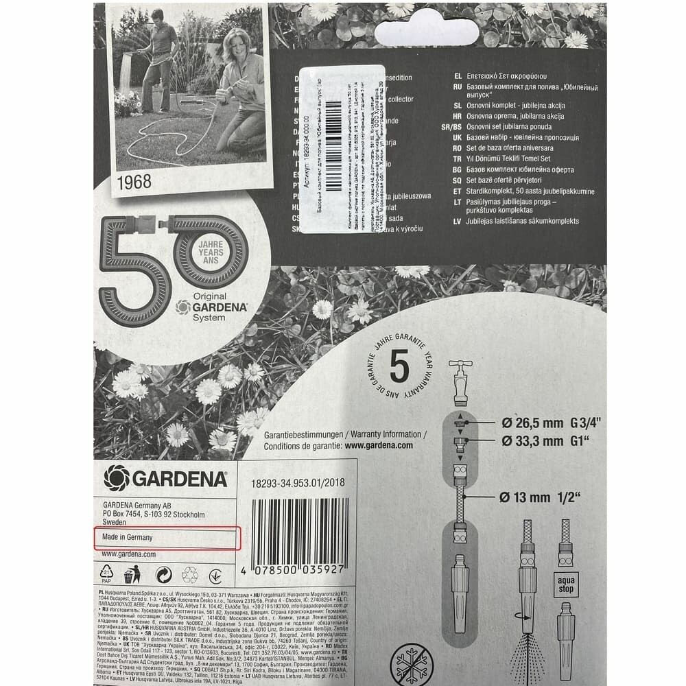 Комплект для полива Юбилейный выпуск включает в себя все основные элементы Базовой системы полива GARDENA: фитинги и наконечник для полива. Позволяет быстро и легко нарастить шланг или подключить необходимый аксессуар. Все соединения герметичны. Полный комплект для запуска. Благодаря комплекту Юбилейный выпуск с соединительными фитингами базовой системы полива его можно сразу прикрепить к шлангу.