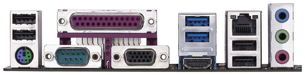 | Разъемы на задней панели | 1x PS/2 клавиатура/мышь, 1x parallel port, 1x serial port, 1x D-Sub, 1x HDMI, 2x USB 3.1, 4x USB 2.0, 1x RJ-45, 3x audio jacks |