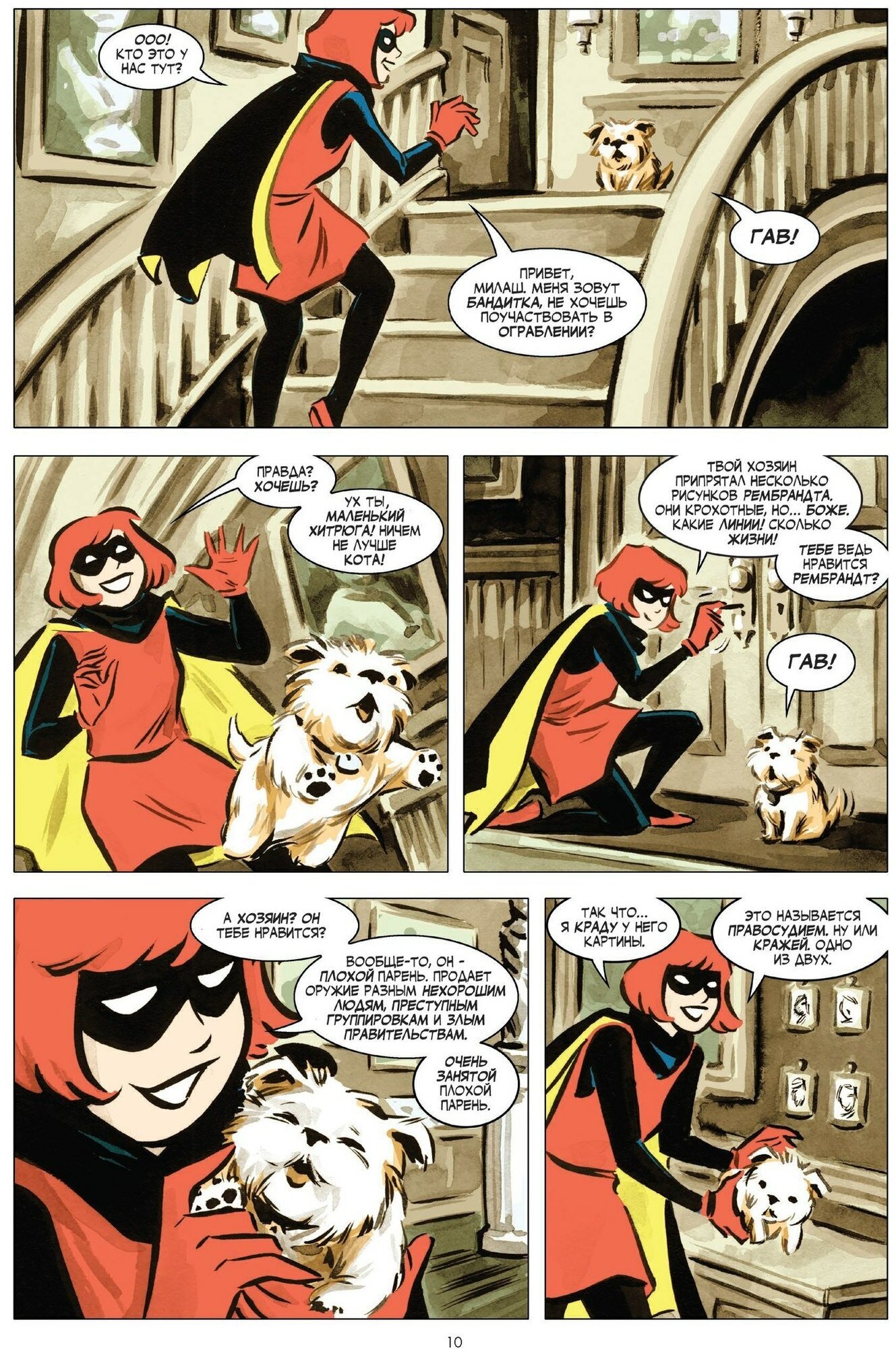 "Бандитка" — юная грациозная воровка с невероятно обходительными манерами и добродушным нравом. В ней нет ни грамма скромности, но при этом вместо наглости и самодовольства она со всеми подчёркнуто-обходительна, манерна, доброжелательна и прямо-таки лучится теплотой и мягким изяществом в каждой ситуации. Комикс то и дело по-доброму подтрунивает над супергеройскими штампами, но его основная цель — дурашливая европейская комедия, т.е. упор тут не на сам сюжет (всегда довольно простой), а на его комическую реализацию и искромётные шуточки по ходу дела. Здесь же необходимо отметить невероятно милый рисунок, он кажется акварельным, но в доп. материалах художница показывает, что это на самом деле тушь (со специальной полу-цифровой обработкой) и тщательно выверенная цветовая гамма.