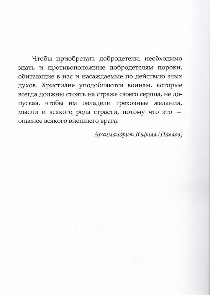 "Чтобы приобретать добродетели, необходимо знать и противоположные добродетелям пороки, обитающие в нас и насаждаемые по действию злых духов. Христиане уподобляются воинам, которые всегда должны стоять на страже своего сердца, не допуская, чтобы им овладели греховные желания, мысли и всякого рода страсти, потому что это опаснее всякого внешнего врага", - говорит архимандрит Кирилл (Павлов). В книгу вошли избранные слова из произведений старца, научающие преодолевать губительные страсти и помогающие стяжать добродетели.