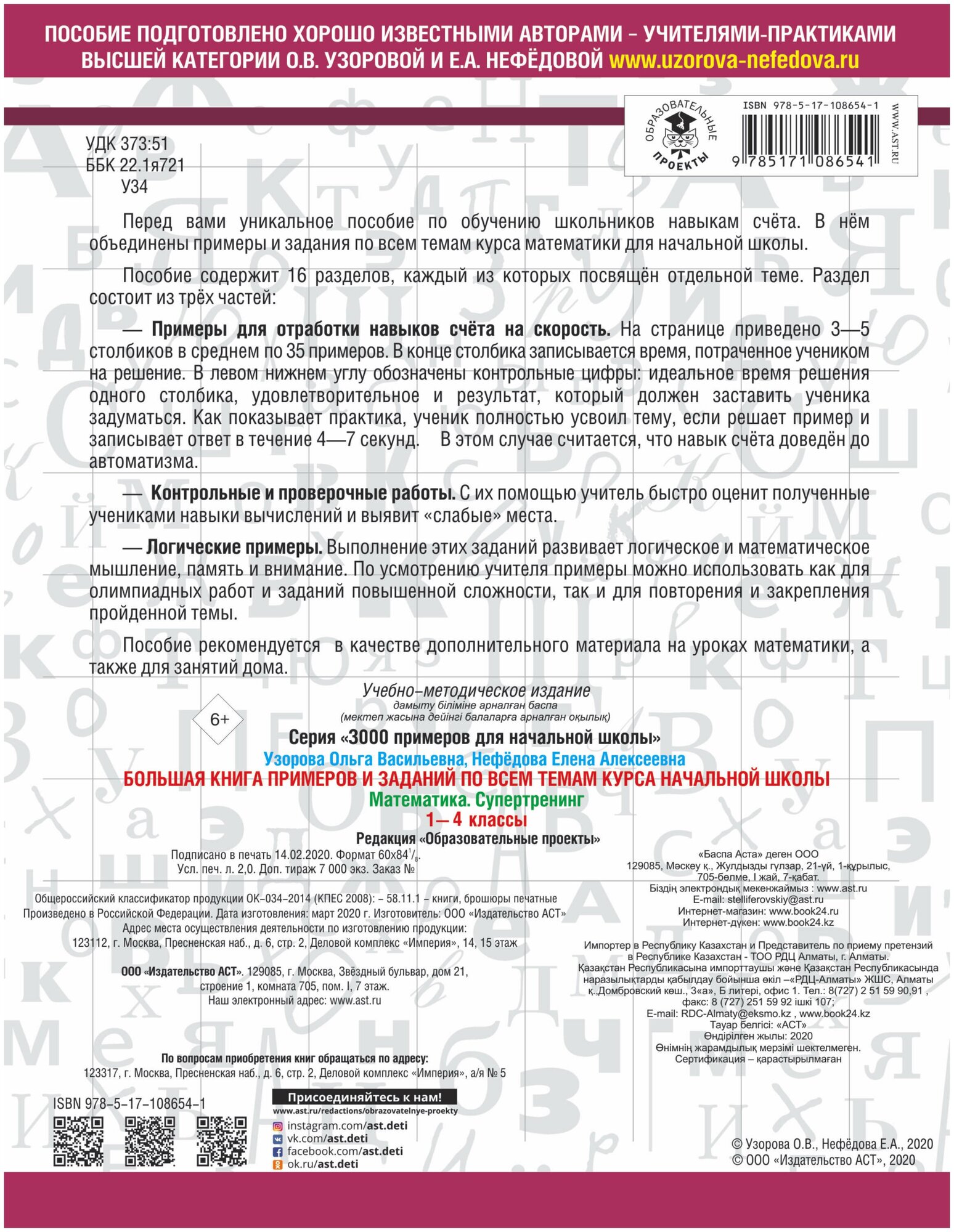 Большая книга примеров и заданий по всем темам курса начальной школы. 1-4 классы. Математика. Супертренинг (Елена Алексеевна Нефедова, Ольга Васильевна Узорова); АСТ, 2024