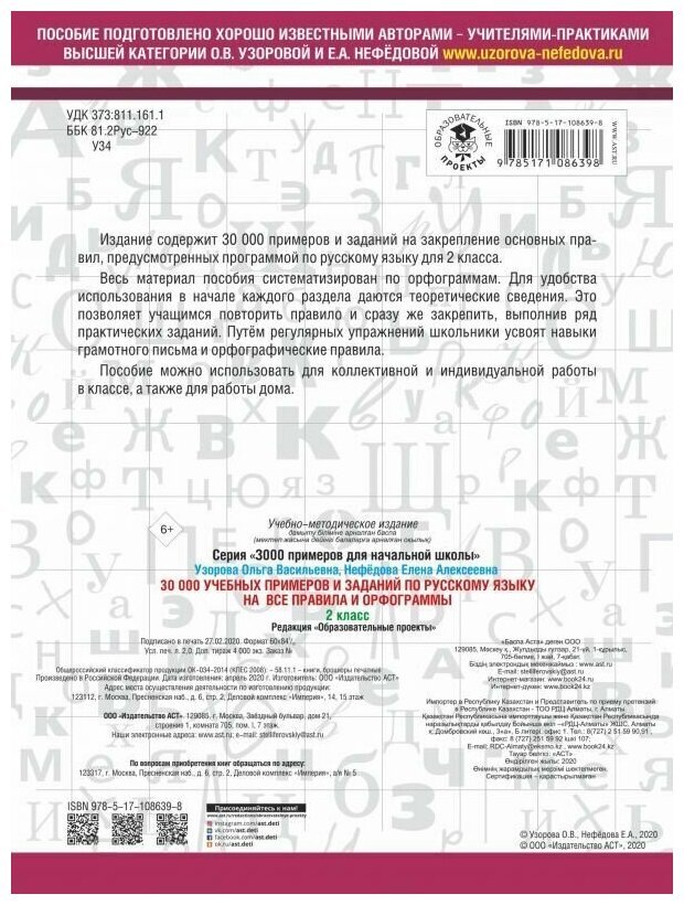 30000 учебных примеров и заданий по русскому языку на все правила и орфограммы. 2 класс (Узорова Ольга Васильевна, Нефедова Елена Алексеевна); ИЗДАТЕЛЬСТВО "АСТ", 2019