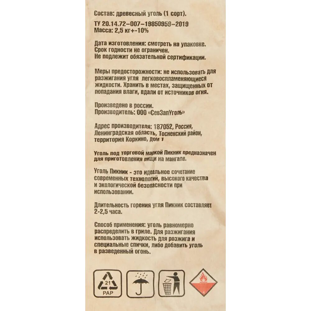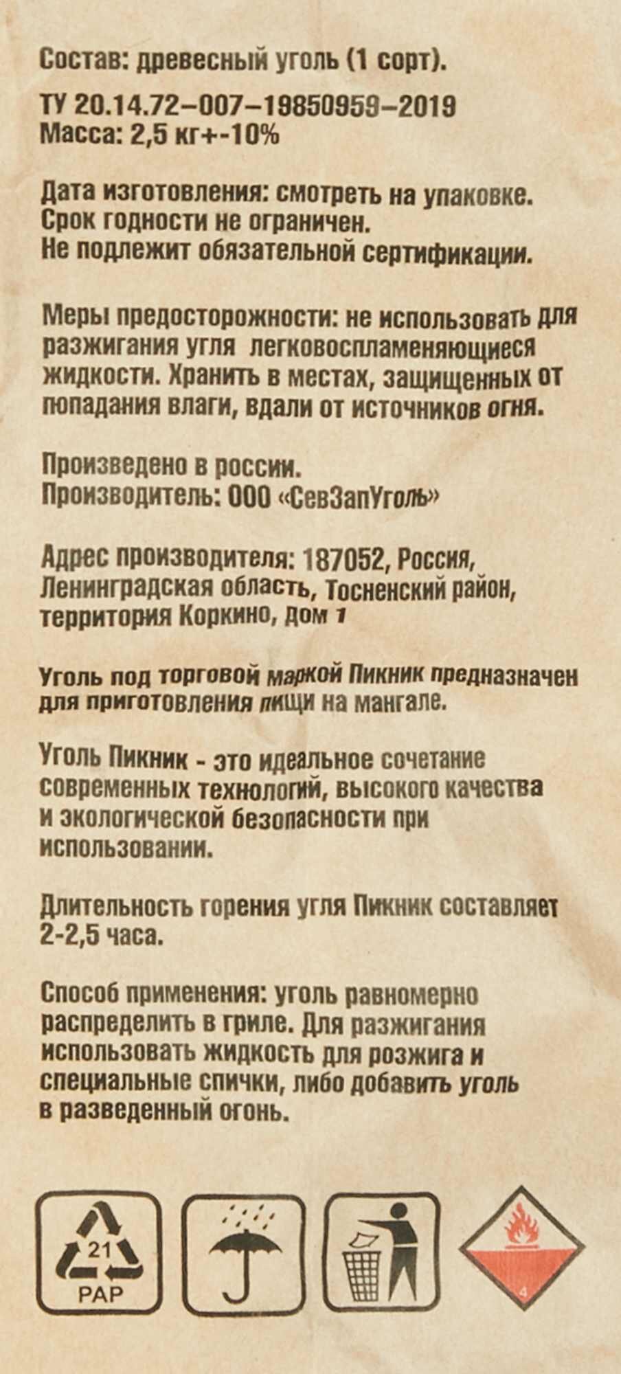 Древесный уголь используется для разведения огня в мангалах, барбекю и тандырах для приготовления пищи. С такой упаковкой вам не придется искать на пикнике дрова и возиться с розжигом отсыревших веток уголь хорошо разгорается и горит на протяжении 4-5 часов.