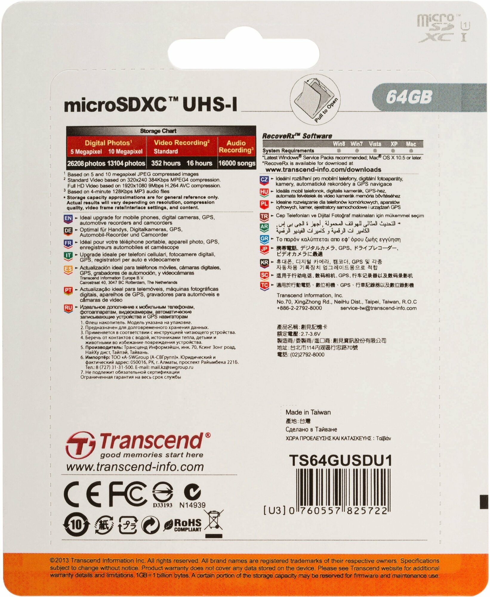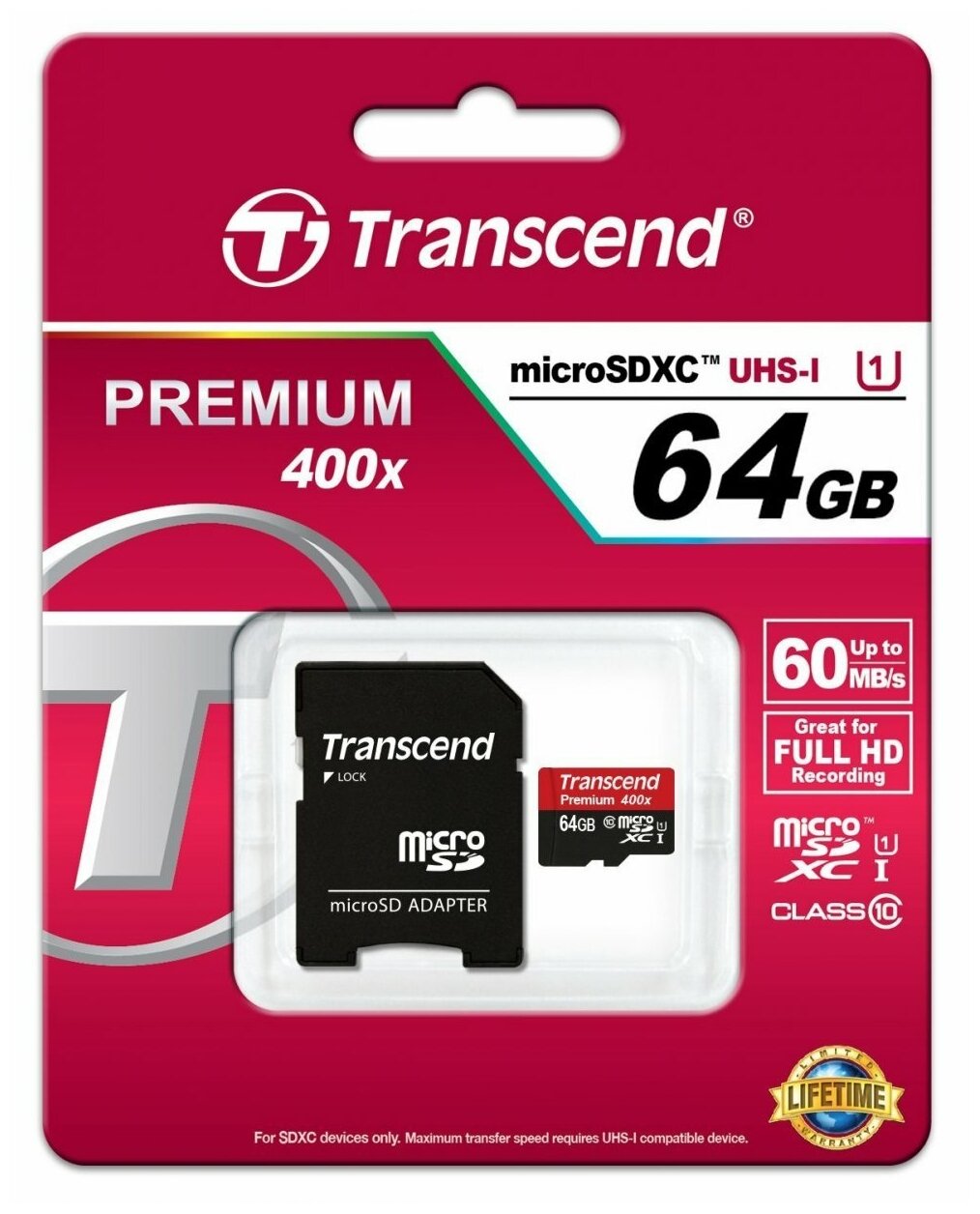 - Transcend microSDXC 64GB Class 10 UHS-I Premium (TS64GUSDU1) + SD-adapter