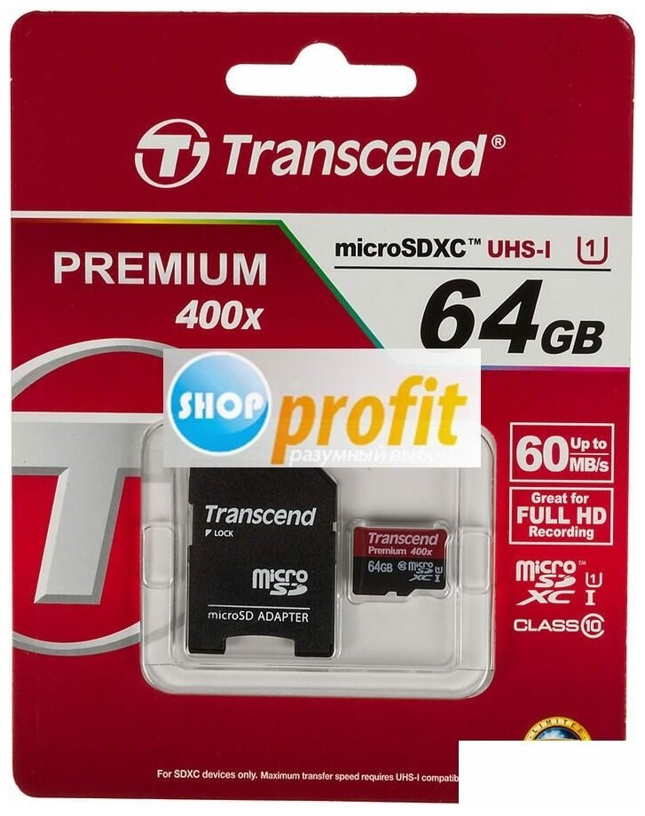 Карта памяти Micro SDXC 64Gb Class 10 Transcend 400x + адаптер SD