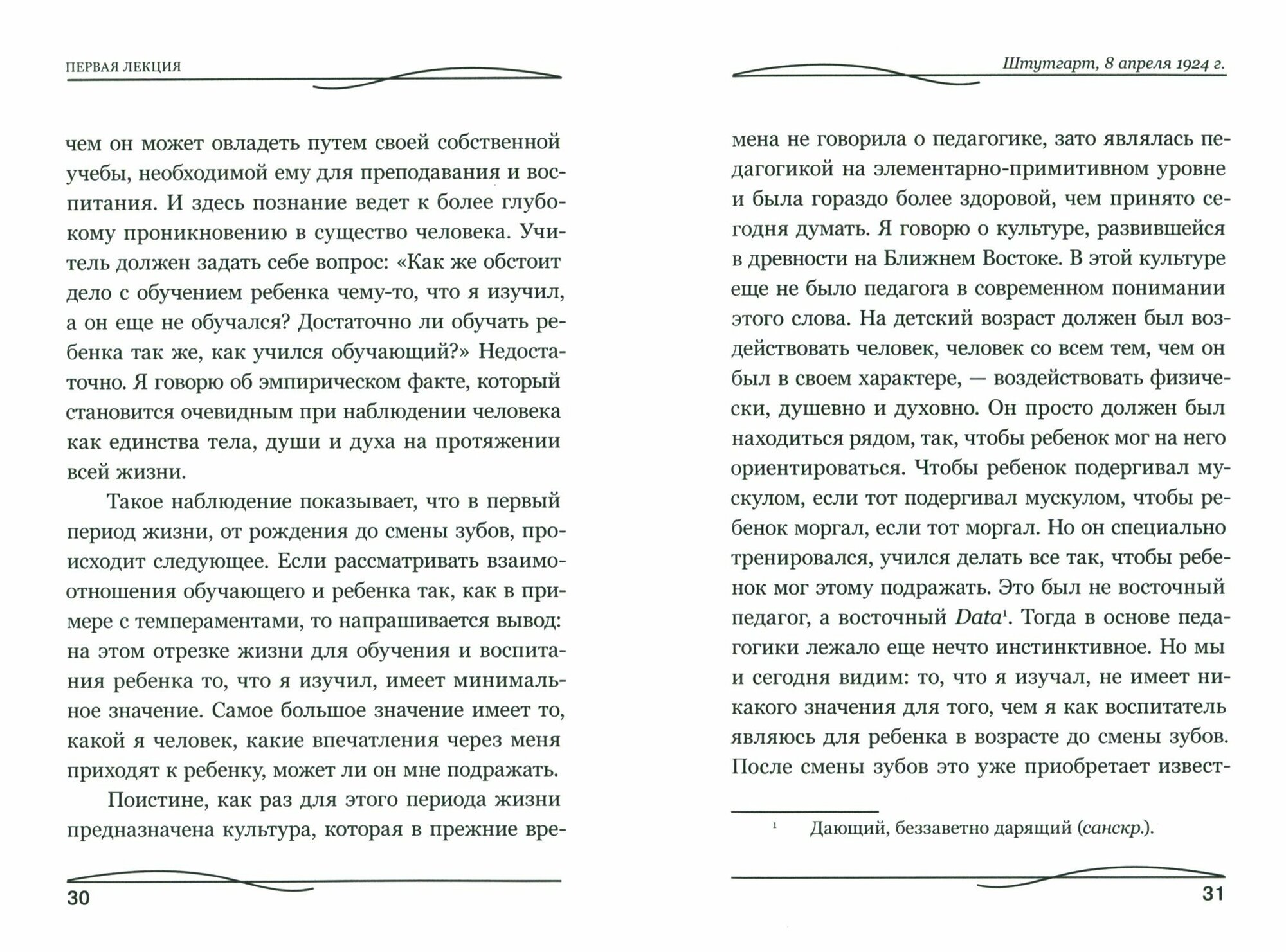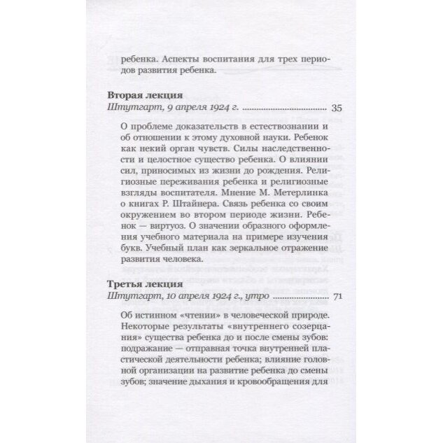 В этом цикле лекций Рудольф Штайнер закладывает основные принципы Вальдорфской педагогики, которые затем будут на протяжении десятилетий развиваться его последователями, в том числе в нашей стране. Штайнер здесь показывает важность личности учителя, формирующего психику ребенка. Он подробно останавливается на взаимозависимости души и тела и показывает, как то, что душа впитала в себя в детском возрасте, проявляется в психике и физическом теле взрослого человека в качестве здоровья или болезни. Подчеркиваются принципы индивидуальности ребенка, естественности окружения, подражания, свободной игры, постепенности и ритмичности. Будет интересна педагогам, последователям антропософии, а также родителям.
