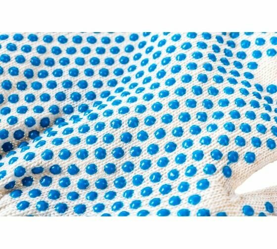 | Прочие особенности и свойства | Изготовлены из натурального хлопка и полиэстра, благодаря чему происходит естественный воздухообмен, и руки "чувствуют себя" комфортно. Элементы из ПВХ на внутренней стороне ладоней обеспечивают лучшее сцепление с охватываемыми предметами и исключают их выскальзывание, поэтому перчатки особенно необходимы для работ, где требуется обеспечить высокую чувствительность пальцев рук. Перчатки имеют эластичные манжеты для дополнительной защиты запястий и удобства работы. |