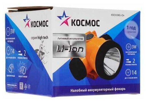 | Прочие особенности и свойства | Фонарь светодиодный аккум. налобный литиевый H3W 2 режима 3Вт LED 1.5А.ч зарядка от USB КОСМОС KOCH3WLi-On |