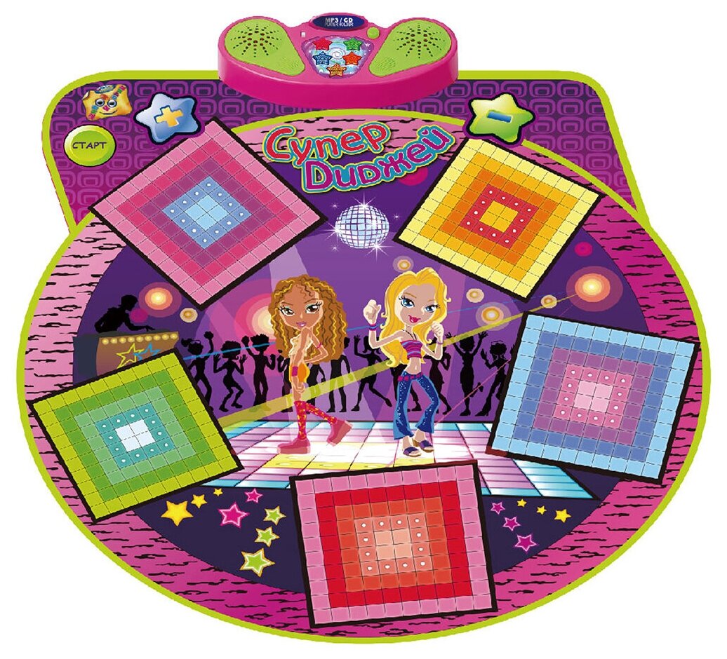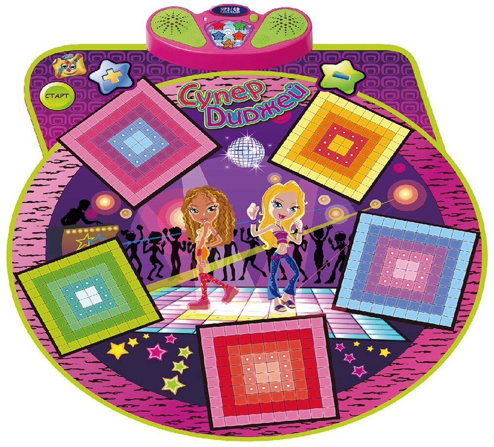 - уникальный напольный звуковой коврик с сенсорными контактами и блоком управления. Коврик с зонами в виде квадратов, светящимися лампочками, а также с возможностью подключения CD/MP3.Наступая на каждый из пяти квадратов, можно воспроизвести определенный оригинальный звуковой эффект, подобный тому, что используют ди-джеи на своих установках. Если к работающему коврику подключить свой носитель звука с помощью аудио-входа, вместо заложенных мелодий заиграет мелодия с подключенного носителя. Идеально подходит для веселого времяпровождения как одному, так и в компании друзей. Клавишами Громкость можно регулировать силу звука. Рекомендуется докупить 4 батарейки напряжением 1,5V типа АА (товар комплектуется демонстрационными).