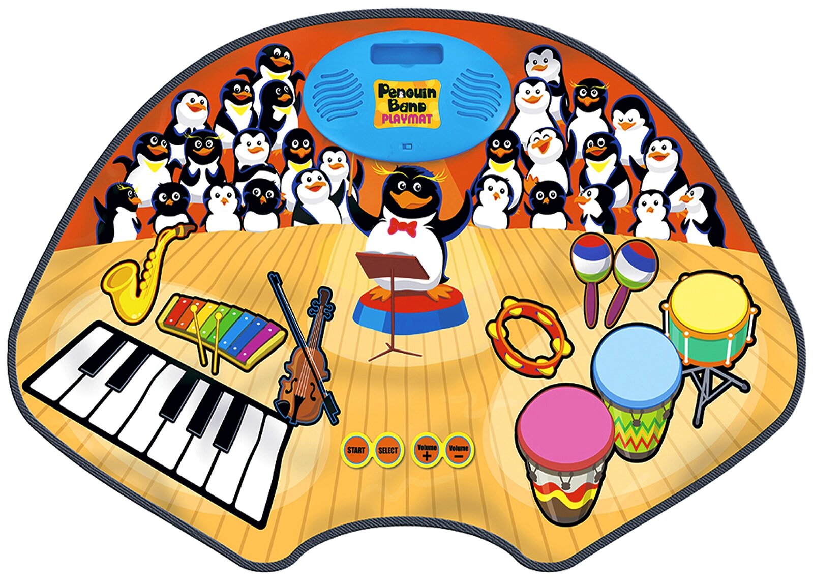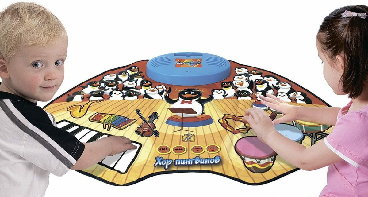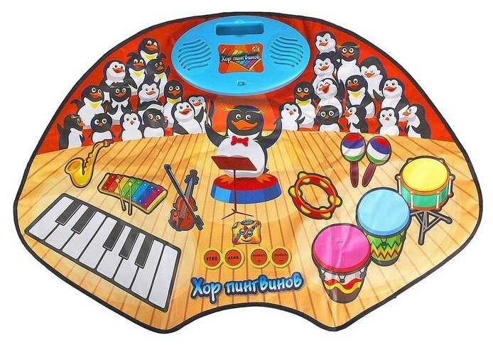 Коврик Хор Пингвинов - это замечательное игровое приспособление, которое обладает широким функционалом и сделает досуг ребенка более увлекательным и насыщенным. У коврика имеются два специальных игровых режима, девять имитаторов музыкальных инструментов и девять же мелодий, которые доступны в звуковом воспроизведении. Еще коврик можно подключать к аудиоплееру. Участвовать в игре с ковриком могут сразу два ребенка. Помимо имеющихся в памяти мелодий, можно также создавать и свои собственные, а потом прослушивать их. Детки смогут проявить себя с творческой стороны и порадовать родителей парой-тройкой композиций собственного сочинения. Материалы изделия не провоцируют возникновение аллергии и приятны на ощупь. Сам коврик имеет интересное оформление: на нем изображен пингвин-дирижер в компании с целым хором.