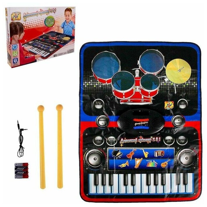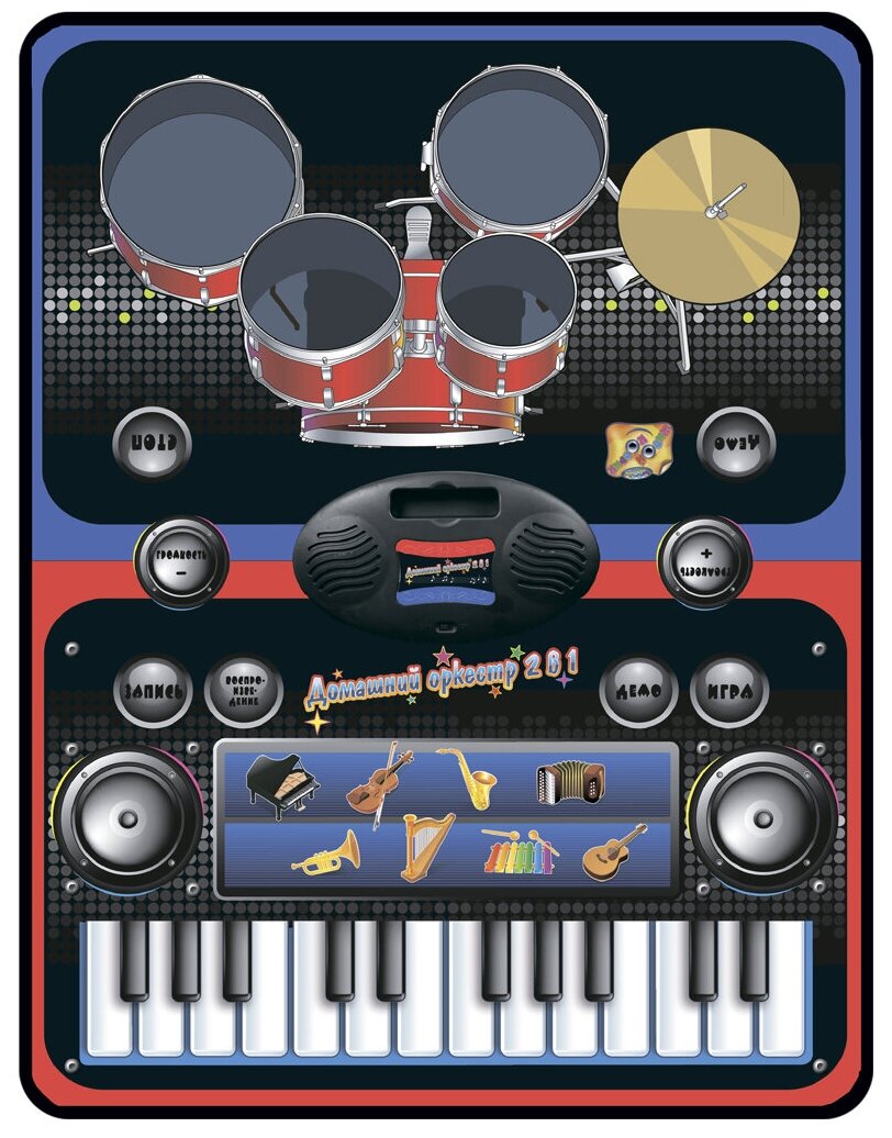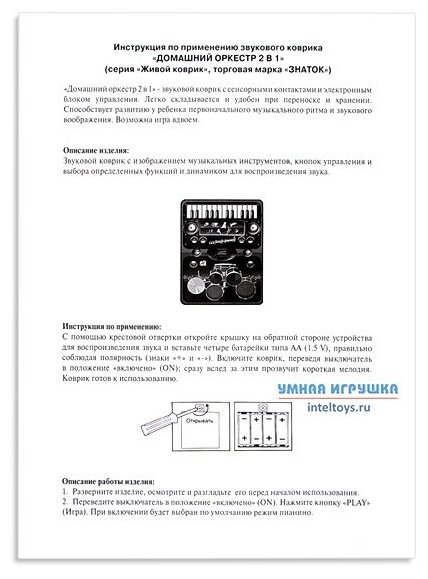 Звуковой коврик с изображением музыкальных инструментов, кнопок управления и выбора определенных функций и динамиком для воспроизведения звука. Воспроизводит звуки восьми музыкальных инструментов. В режиме Демо можно прослушать 14 мелодий. Способствует развитию у ребенка первоначального музыкального ритма и звукового воображения. Возможна игра вдвоем. В режиме Запись возможно записать до 80 звуков. Возможно подключение MP3-плеера. Клавишами Громкость можно регулировать силу звука. Для экономии батареек имеется спящий режим. Для работы необходимы 4 батарейки или аккумулятора размера АА (в комплект не входят). В комплект входит аудио-шнур и барабанные палочки с резиновыми головками. Не стирать! Загрязнения необходимо удалять влажной тряпкой при выключенном питании. Коврик легко складывается и удобен при переноске и хранении. Дети легко обучаются обращению с ним. Он не только доставит детям удовольствие, но также позволит весело сделать зарядку.