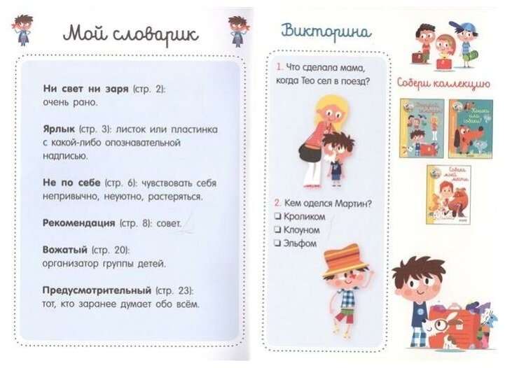 Ребенок при чтении расширяет свой словарный запас, учится строить предложения и выражать свое мнение. Читать с ребенком лучший способ развивать его коммуникативные навыки. Благодаря крупному шрифту и ярким картинкам книга Выручай, чемодан! станет отличным помощником малышу, который учится читать. Неожиданный поворот сюжета, словарик с новыми словами в конце книги, тут есть все, чтобы научиться чтению и полюбить его. Все смеются над огромным чемоданом Тео. В нем так много всякой всячины. Н вот Матис разорвал свою одежду, Лина боится плавать, а у Мартина нет костюма на маскарад. Без паники! Тео придет на помощь, ведь у него есть выручай, чемодан ! Книга Выручай, чемодан! входит в коллекцию Каникулы с пользой . С книгами и играми из этой коллекции родители и дети получат удовольствие и максимум пользы на каникулах. Сотни идей для совместных занятий, увлекающих в мир знаний и новых открытий у вас под рукой!