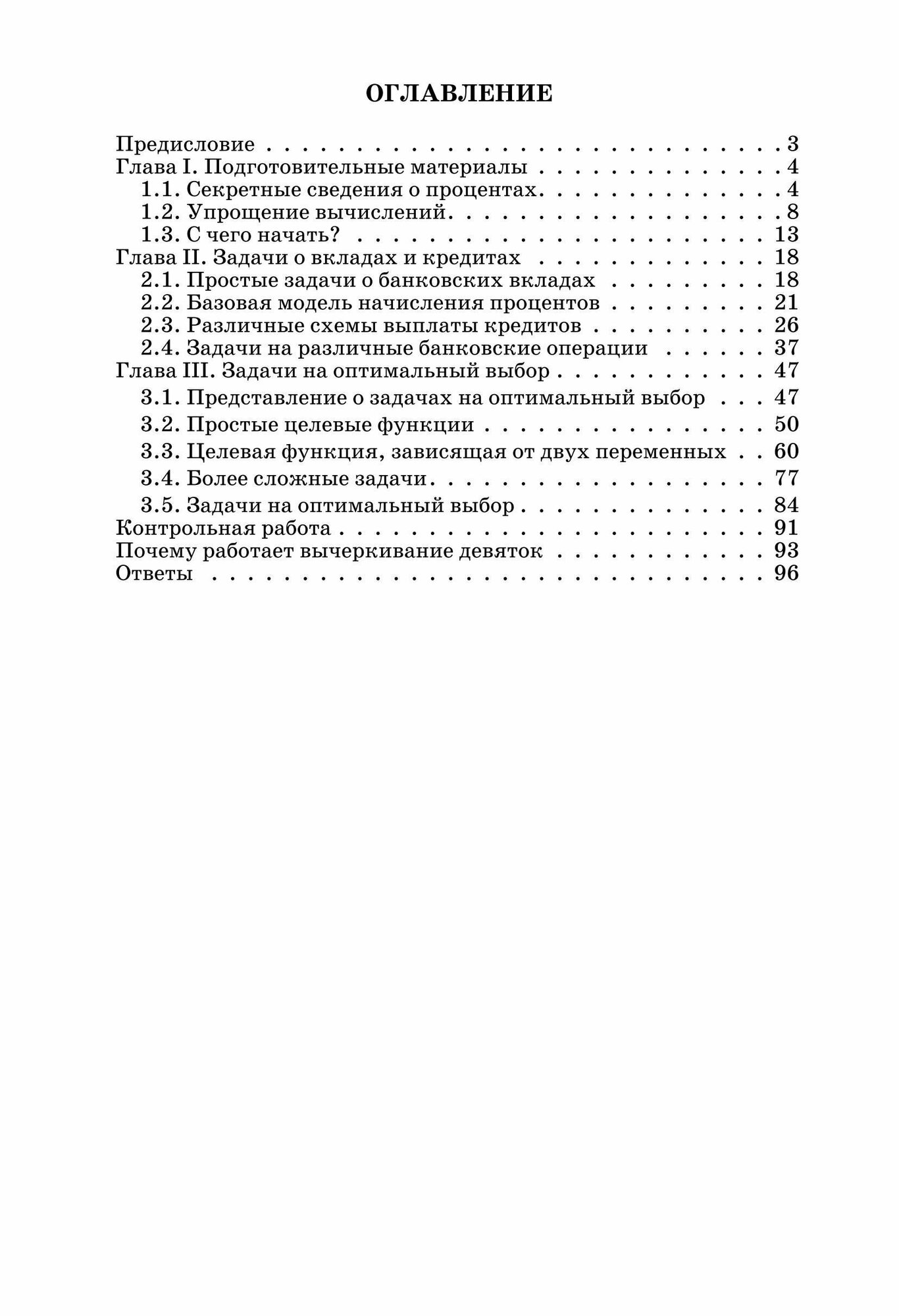 В первой главе из 13 страничек - подготовительные материалы. Здесь - о процентах, как увеличить(уменьшить) число на несколько процентов путем умножения на некоторое число, простейшие задачи на проценты, об упрощении вычислений, о проверке вычислений "путем вычеркивания девяток".Далее во второй главе рассматриваются задачи на вклады и кредиты. Все подробно с решениями, приводится много задач и для самостоятельного решения. В третьей главе - задачи на оптимальный выбор. Аналогично - задачи с объяснениями и задачи для самостоятельного решения. Заканчивается книжка контрольной работой в 2 вариантах. Очень хорошее издание.Сразу - в дело :)