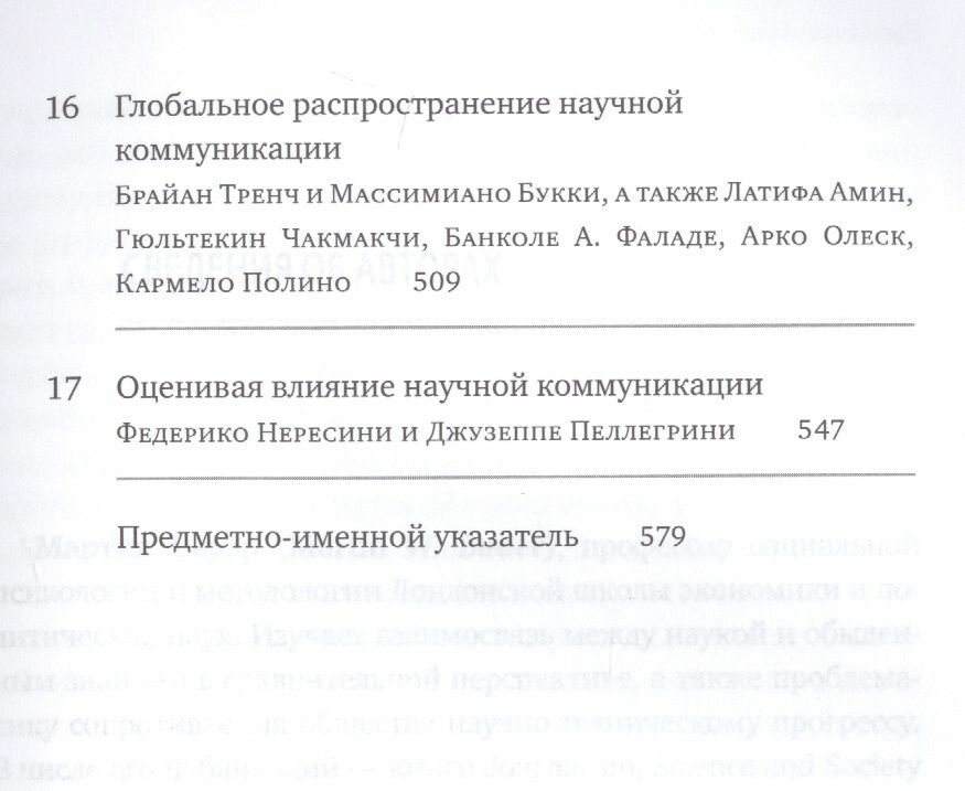 «Пособие по общественным связям в науке и технологиях» под редакцией Массимиано Букки и Брайана Тренча представляет собой самый подробный обзор важнейших проблем, перспектив и актуального состояния столь быстроразвивающейся области, как коммуникация между наукой и обществом. Особое внимание авторы уделяют феномену глобального распространения научной коммуникации и определяющей роли цифровых медиа в этом процессе. Международный коллектив авторов, широкий охват тем и междисциплинарный подход делают это пособие фундаментальной энциклопедией для профессионалов, а содержащиеся в каждой главе «ключевые вопросы» станут незаменимым подспорьем для студентов и преподавателей научной коммуникации.