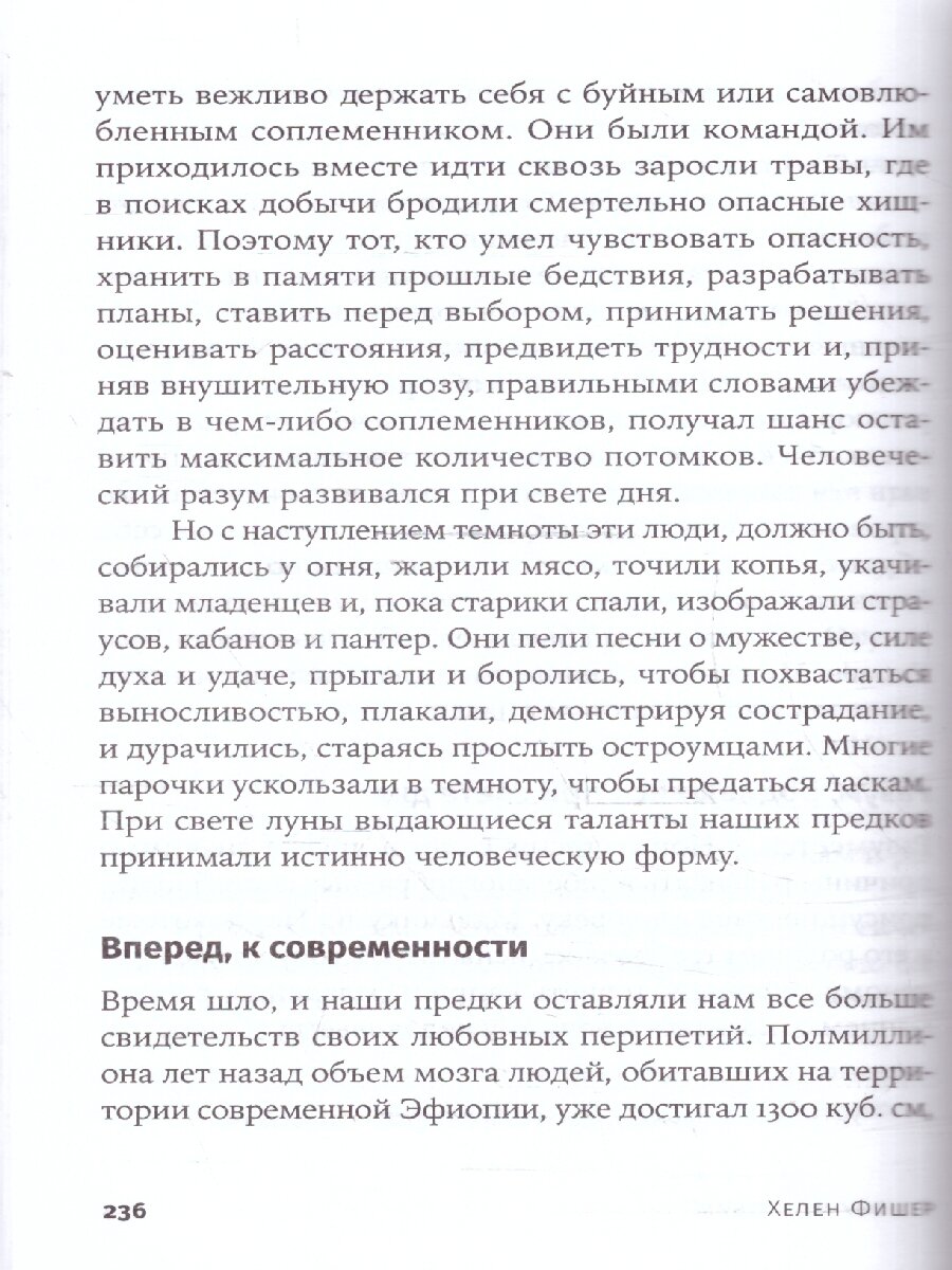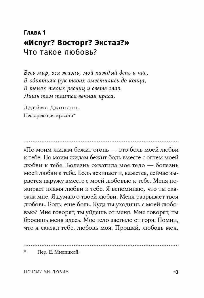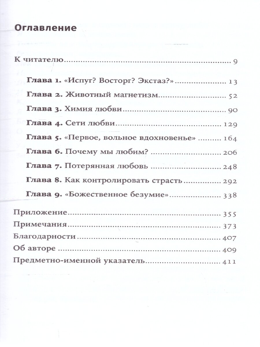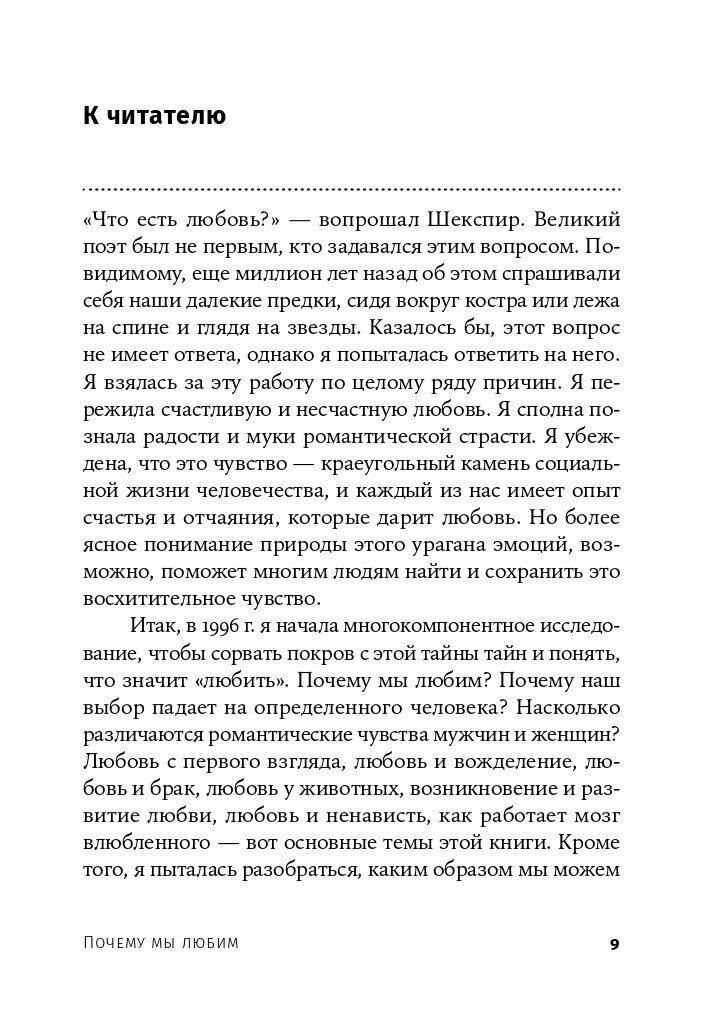 Познавательная книга, содержащая большое количество интересных статистических данных и фактов, которые касаются не только биохимии любовных процессов, но и антропологии. Эта книга будет полезна для тех, кто хочет узнать, что же на самом деле стоит за нашей страстью, жаждой отношений, какие химические процессы претерпевает наш мозг в процессе влюблённости. Но истинным романтикам или людям, не готовых к порой очень нудному научному тексту, эта книга не зайдёт.