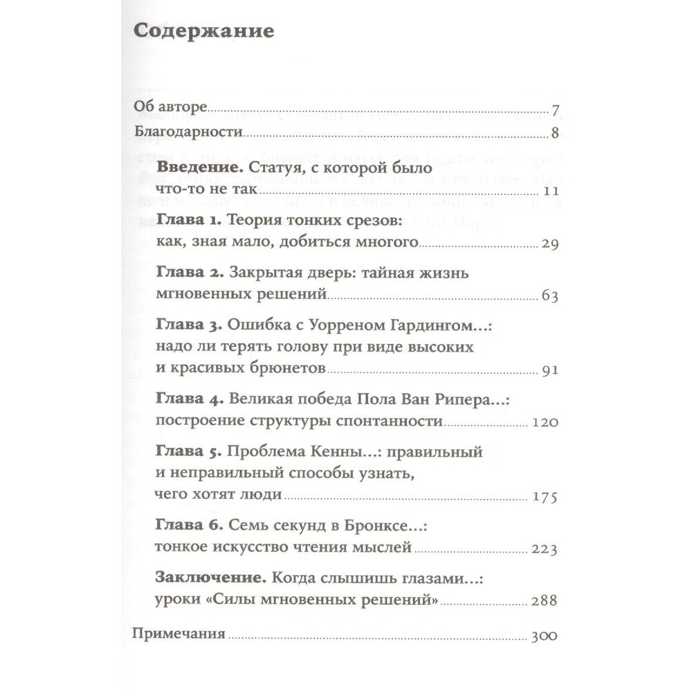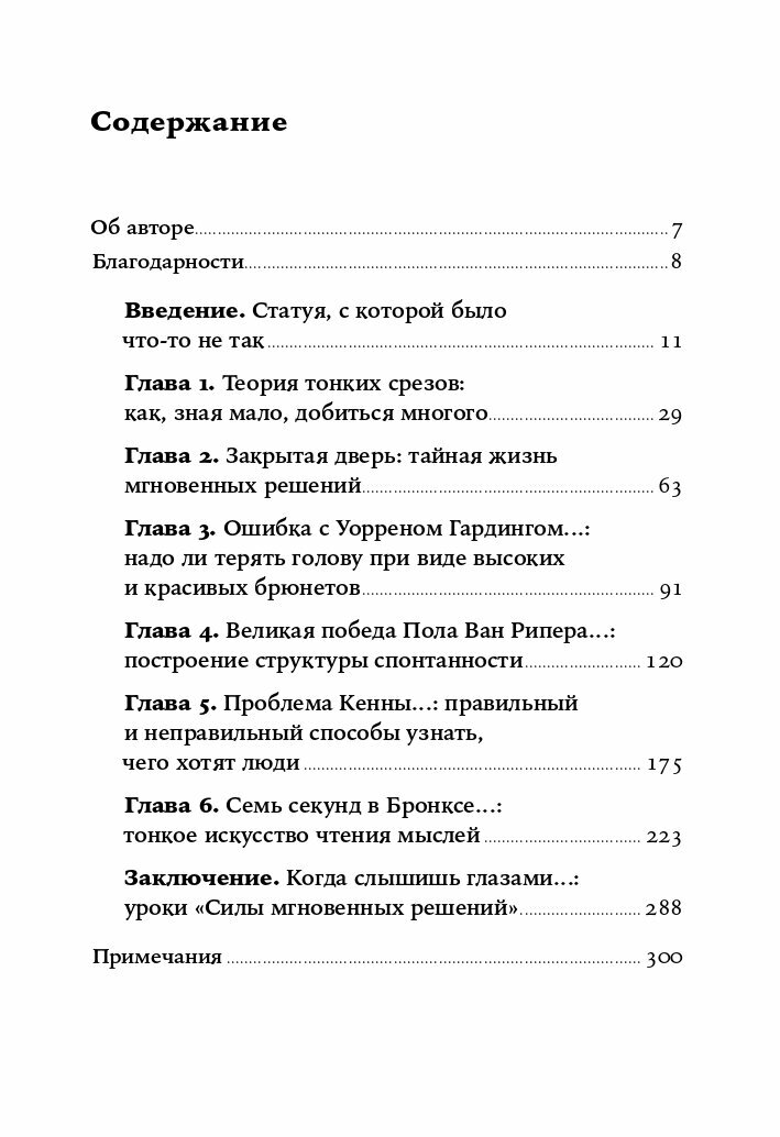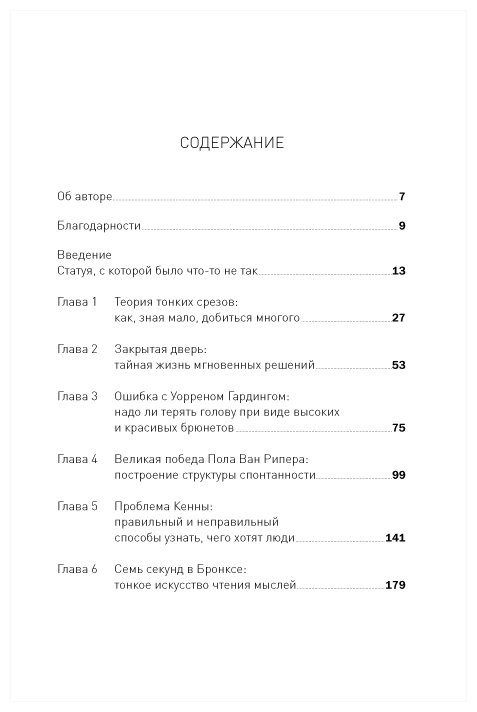 Полицейские в суматохе не разобрались и застрелили безоружного. Специалисты за год исследований не смогли установить поддельность статуи, а один исследователь понял это мгновенно. На пост президента США в 1921 году был избран Уоррен Гардинг - посредственный и незадачливый политик, а ведь он так понравился избирателям. Почему произошли эти роковые ошибки? Можно ли было избежать их? Когда стоит доверять первому впечатлению, а когда требуется подумать?