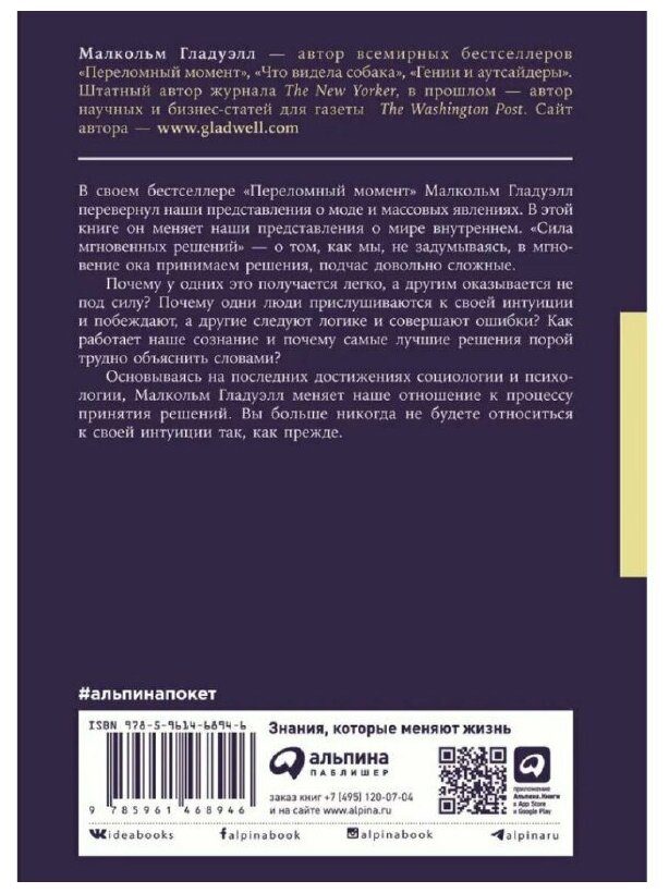 В своей увлекательной книге Малкольм Гладуэлл анализирует процесс принятия решений. На богатом материале из области искусства, науки, дизайна, медицины, политики и бизнеса он раскрывает закономерности бессознательных решений и анализирует факторы, искажающие этот процесс. Книга будет интересна всем специалистам, успешность деятельности которых зависит от умения принимать важные решения (подчас в условиях острого дефицита времени), а также широкому кругу читателей, интересующихся последними достижениями психологии.