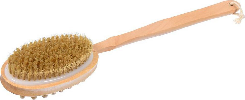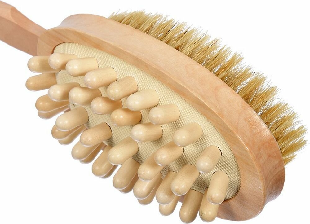 Щетка - хорошая альтернатива обычной мочалке. Щетина эффективно очищает кожу от грязи и ороговевших клеток. Мягкие ворсинки очень деликатно справляются со своей задачей и хорошо вспенивают гель для душа. На противоположной стороне размещен массажер в виде деревянных цилиндров небольшого размера. Это приспособление хорошо разгоняет кровь и избавляет от усталости и напряженности. Длинная рукоять позволяет с комфортом проводить массаж спины или стоп.