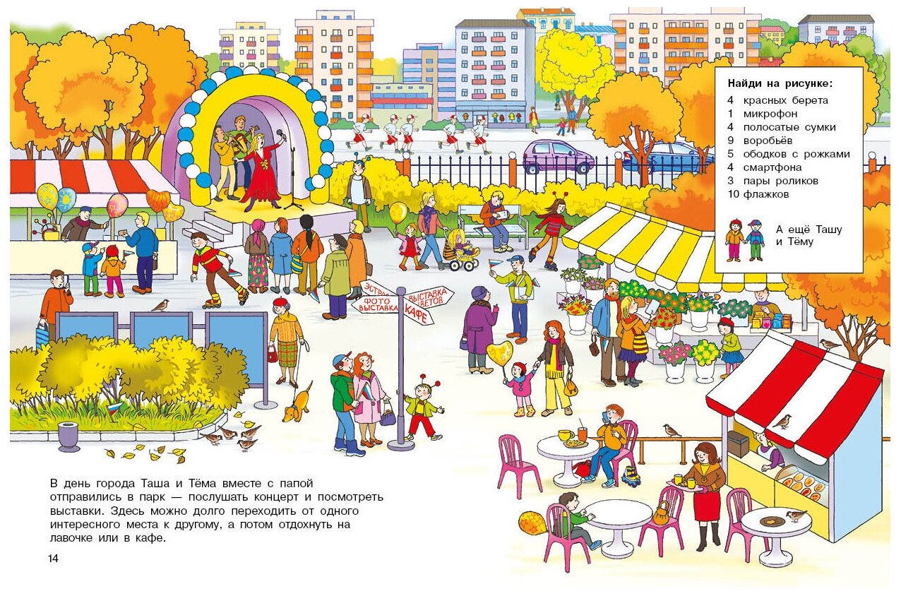 Это книжечка-гляделка, книга-находилка, книга-развивашка, книга-игра! Герои книжечки Таша и Тема, с ними детки отправляются в городской парк, детский утренник, ботанический сад, на дачу, на речку, в луна-парк, в зоопарк и много ещё куда! Книжечка интересна как ребенку 6 лет, так же и ребенку которому всего 2 годика! С удовольствием сидят играют, рассматривают картинки. Книжечка исполненна в мягком переплете, поэтому ее можно взять с собой в дорогу и на дачу.
