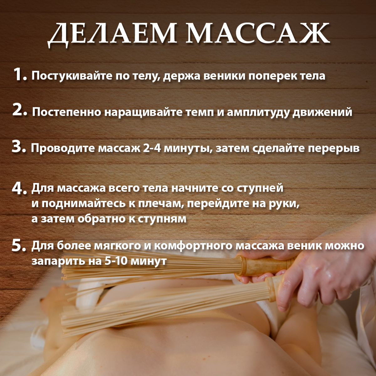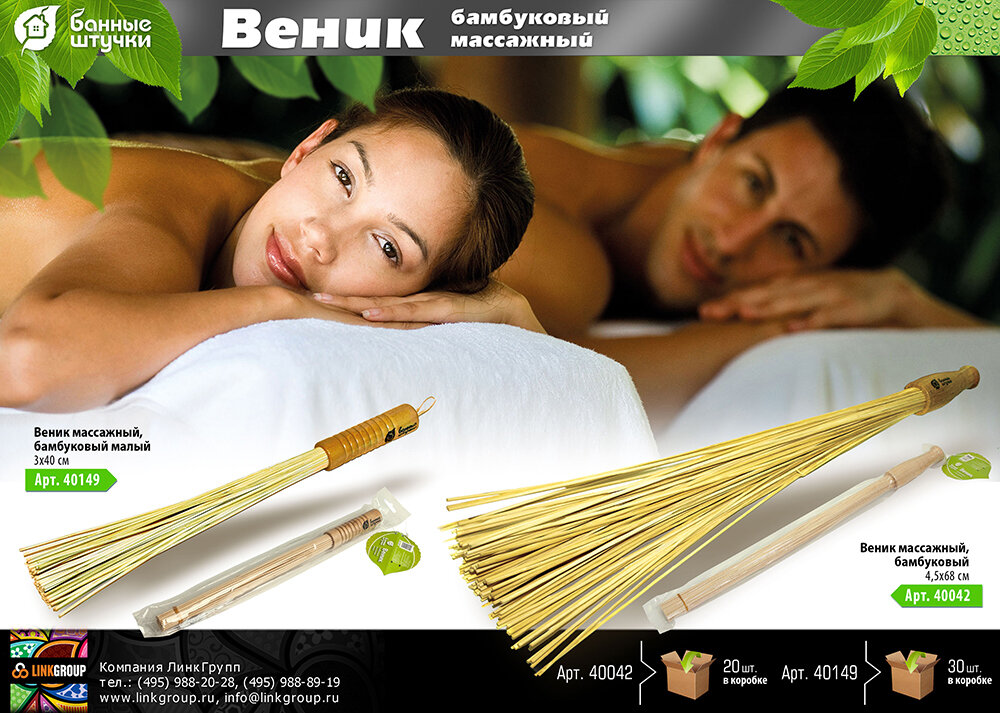 Бамбуковый веник предназначен для проведения целебного массажа в бане или сауне. Такой массаж усиливает кровообращение, ускоряет обмен веществ, помогает расслабиться напряженным мышцам. Для усиления эффекта массажа на бамбуковые палочки можно нанести несколько капель эфирного масла или ароматизатора. Массаж бамбуковым веником обычно длится не более 3 минут. Веник не требует замачивания или распаривания. После использования веник необходимо просушить и хранить в сухом месте.