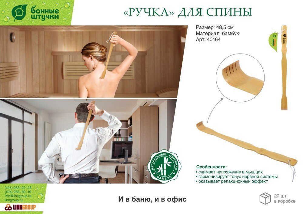 Массажная ручка предназначена для массажа спины и используется в бане или сауне. Ручка изготовлена из экологически чистого материала - бамбука. Изделие обеспечивает деликатный массаж в области спины, создает расслабляющий эффект и способствует улучшению кровообращения.