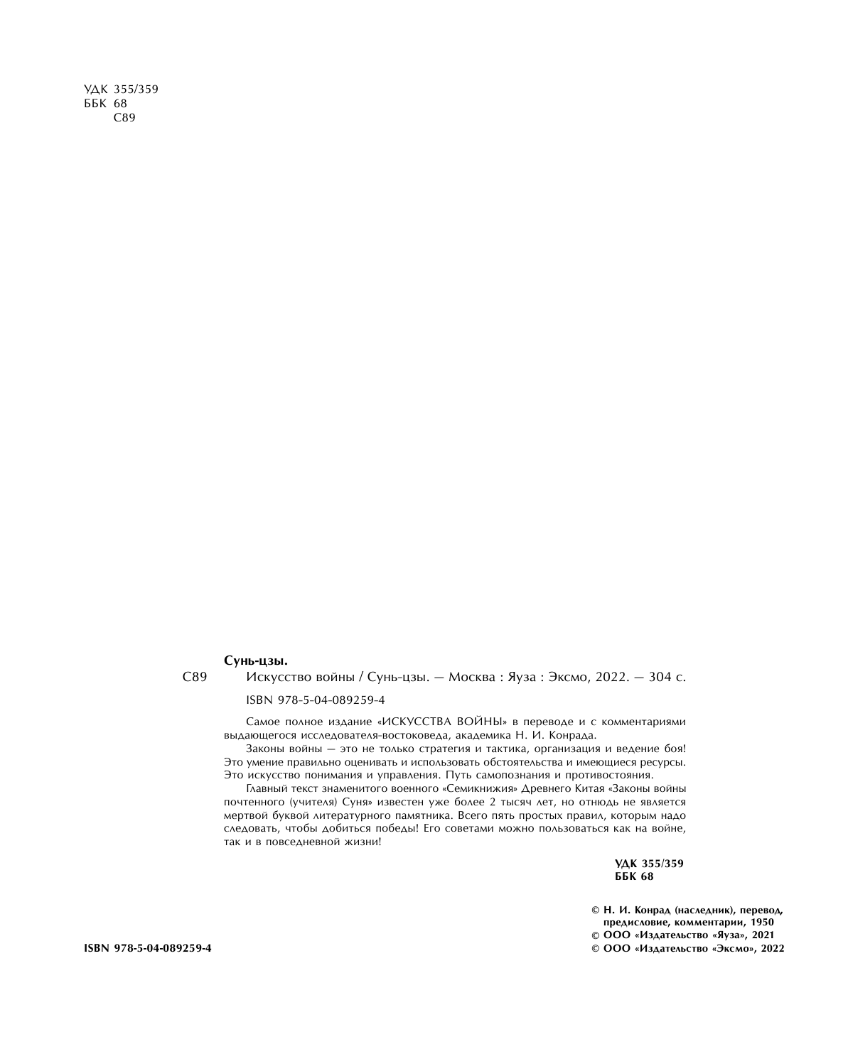 Самое полное издание "Искусства войны" в переводе и с комментариями выдающегося исследователя-востоковеда, академика Н. И. Конрада. Законы войны - это не только стратегия и тактика, организация и ведение боя! Это умение правильно оценивать и использовать обстоятельства и имеющиеся ресурсы. Это искусство понимания и управления. Путь самопознания и противостояния. Главный текст знаменитого военного "Семикнижия" Древнего Китая "Законы войны почтенного (учителя) Суня" известен уже более 2 тысяч лет, но отнюдь не является мертвой буквой литературного памятника. Всего пять простых правил, которым надо следовать, чтобы добиться победы! Его советами можно пользоваться как на войне, так и в повседневной жизни!