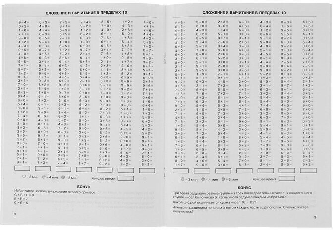 Книжка замечательная. Примеры все не сложные, в приделах 10 (число 0 присутствует), но сама идея решать их на время разогревает у ребенка азарт. Единственное что портит идею - очень мелкий шрифт, деткам 1 класса ещё трудно писать так мелко и цифры залезают друг на друга.