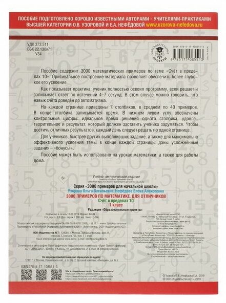 3000 примеров по математике + бонус. 1 класс. Счет в пределах 10 (Елена Алексеевна Нефедова, Ольга Васильевна Узорова); АСТ, 2024
