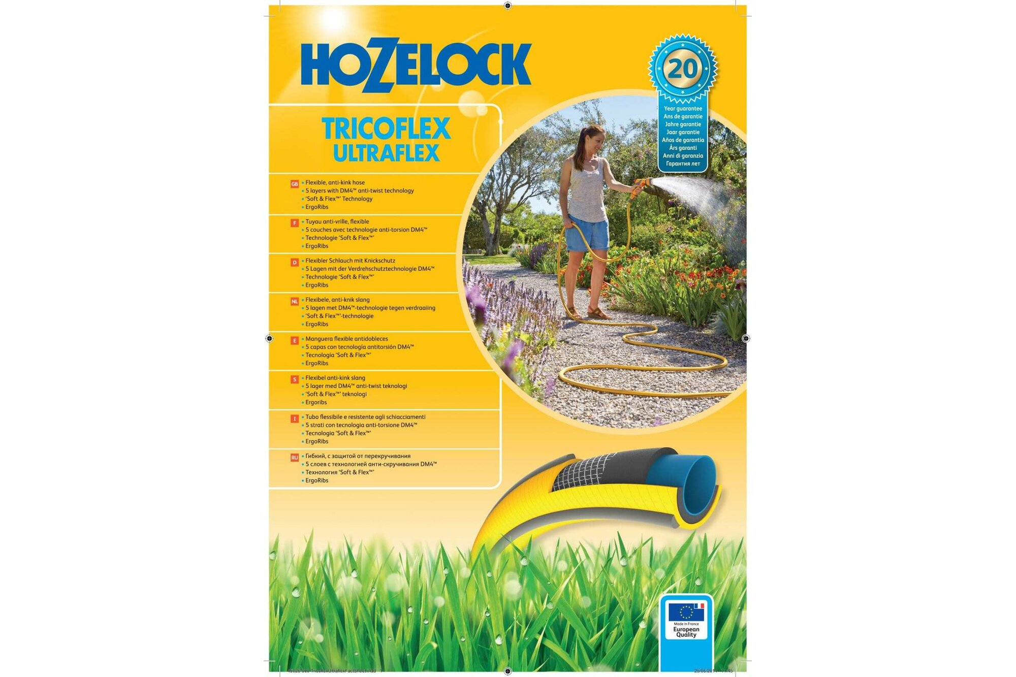 Состоящий из 5-ти слоев шланг HoZelock TRICOFLEX ULTRAFLEX изготовлен по технологии, которая позволяет шлангу легко маневрировать по участку. Гладкий внутренний слой обеспечивает максимальный ток воды. Слой из ПВХ по технологии SoftFlex придает прочность стенкам шланга, облегчает вес (до 25% легче, чем у конкурентов) и улучшает маневренность. Шланг удобен в эксплуатации - легко сматывается в катушки и системы хранения. Специальное армированное плетение по технологии TNT предотвращает деформацию шланга при скручивании; внешний слой из ПВХ защищает от повреждений, изготовлен по технологии Ergo Rib, благодаря которой шланг комфортно держать в руке. Яркий желтый цвет позволяет Вам без труда увидеть шланг на Вашем участке. Материалы, из которых состоит шланг, являются безопасными для человека и окружающей среды - не содержат фталатов, тяжелых металлов и вредных токсинов.