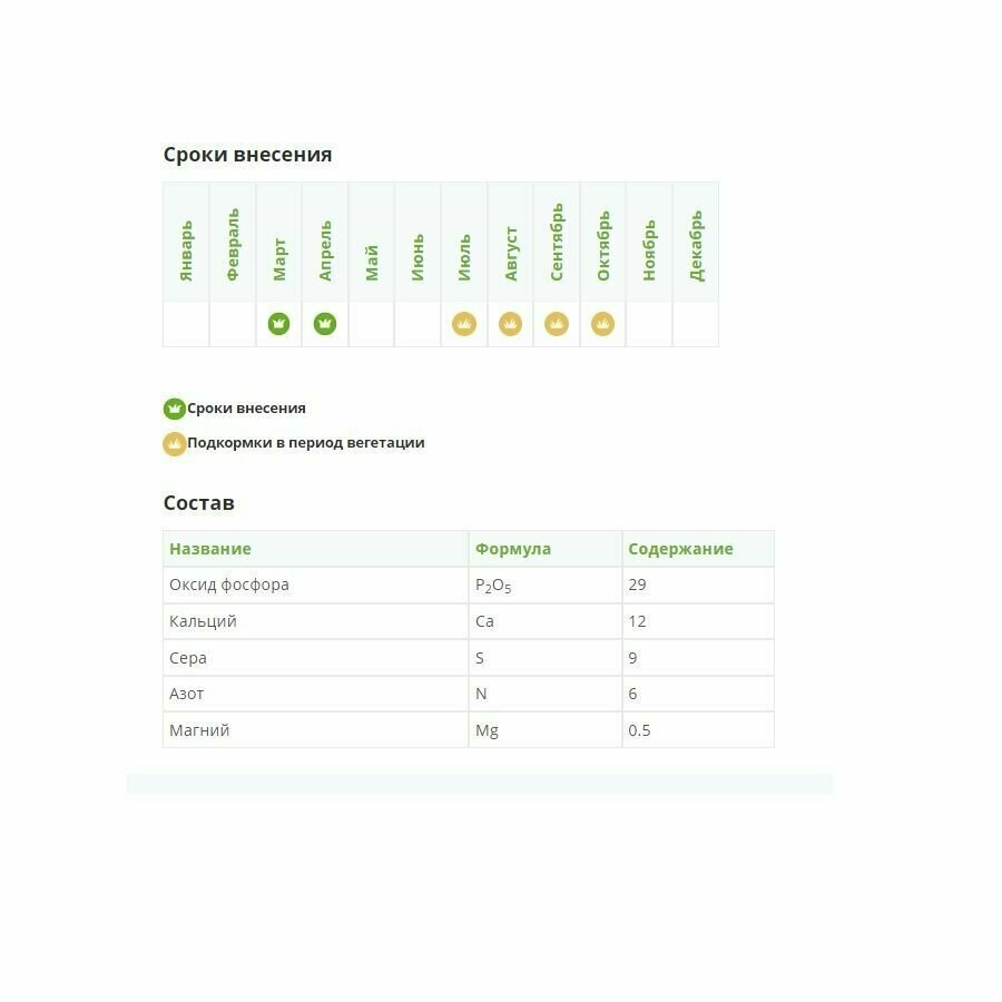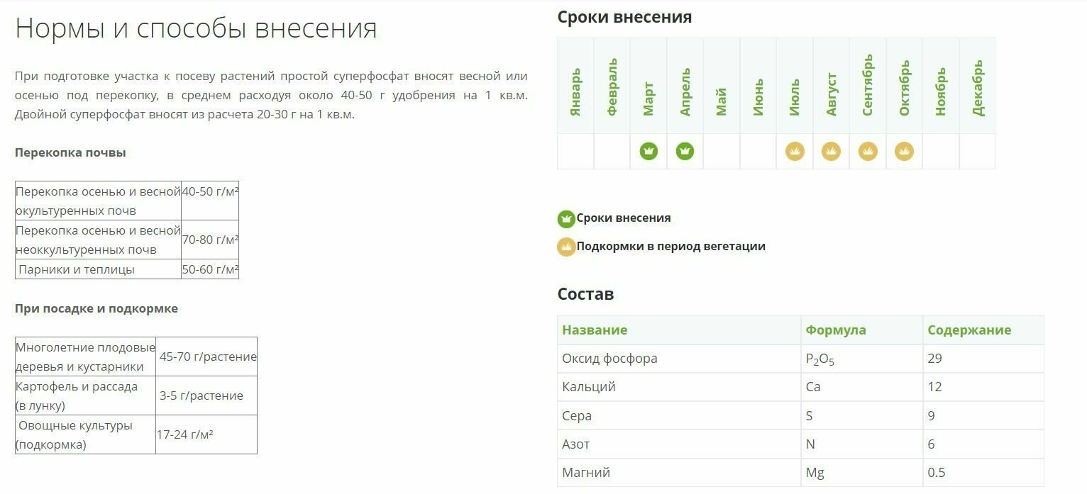 | Способ применения | При подготовке участка к посеву растений простой суперфосфат вносят весной или осенью под перекопку, в среднем расходуя около 40-50 г удобрения на 1 кв.м. Двойной суперфосфат вносят из расчета 20-30 г на 1 кв.м. |