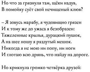 "Мы ужаснее всех, мы несчастнее всех, / Мы несчастней, ужасней, уродливей всех! / Кто нас только увидит - бежит без оглядки, / И никто нас не любит, и всем-то мы гадки…".
