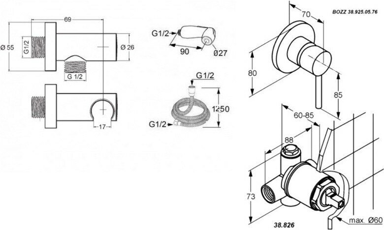 | Комплектация | скрытая монтажная часть, душевой шланг, подключение для душевого шланга с держателем, душевая лейка |