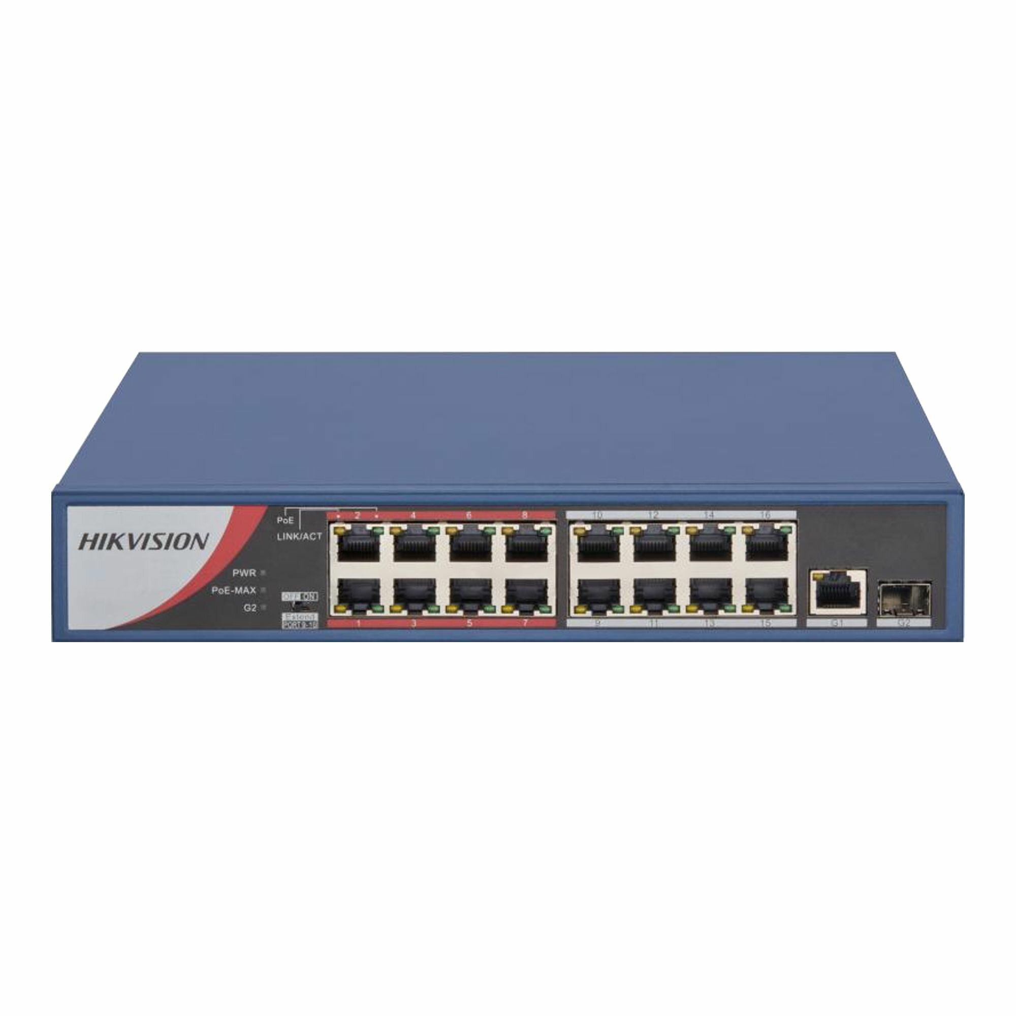 Hikvision DS-3E0318P-E/M(B) - неуправляемый коммутатор 16 RJ45 100M PoE с грозозащитой 6кВ. 1 Uplink порт 1000М Ethernet. 1 Uplink порт 1000М SFP, бюджет PoE 130Вт. Порты 9-16 поддерживают режим передачи до 250м, 10Мб/с, CAT5e. Размер таблицы MAC-адресов — 4К. Передача до 250 м.