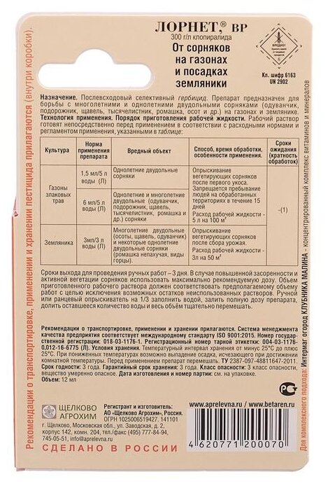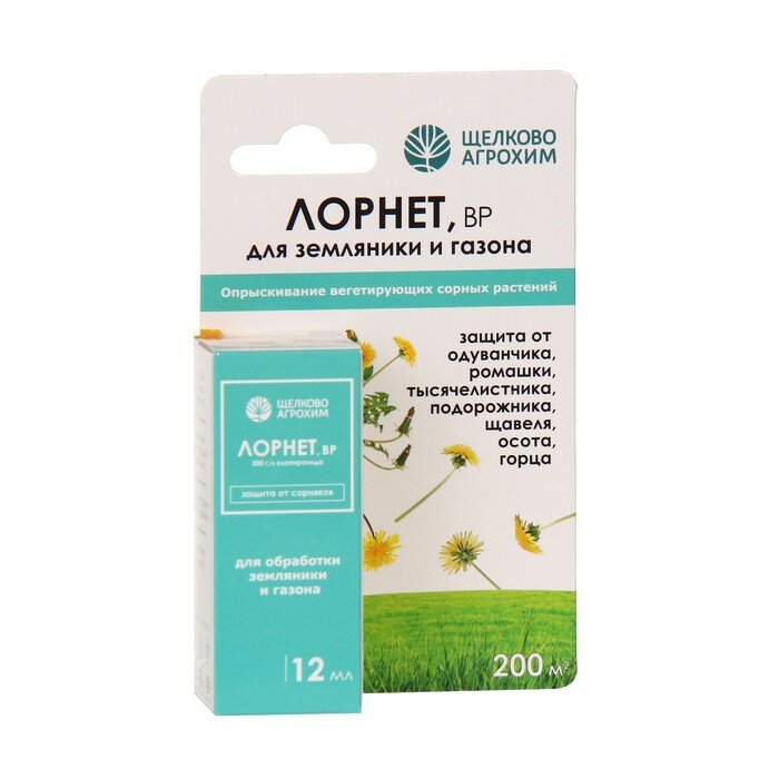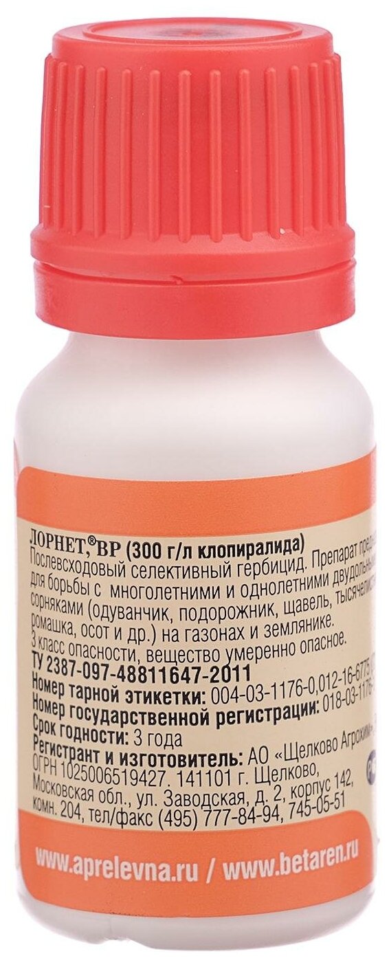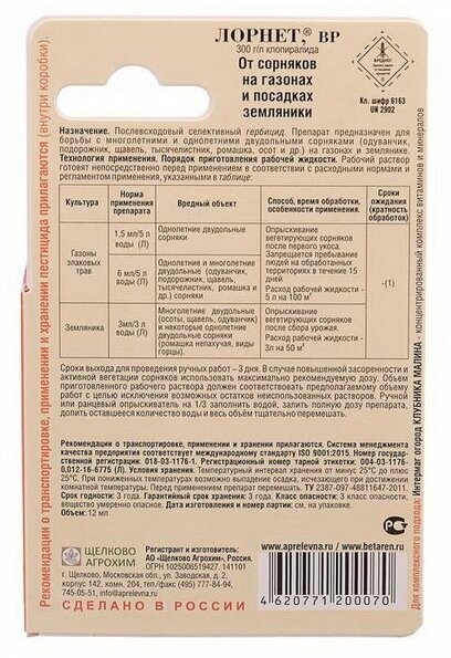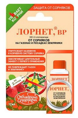 | Способ применения | средством Октябрина Апрелевна Лорнет наиболее эффективно опрыскивать сорняки на газоне после первого скашивания травы; посадки садовой земляники рекомендуется обрабатывать после сбора урожая |
