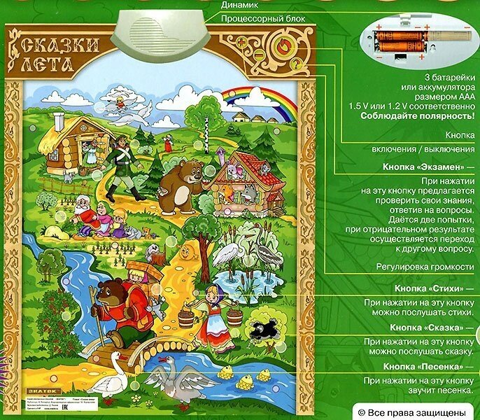 Великолепный электронный сборник сказок в виде плаката подарит ребенку море эмоций. Здесь ему будут доступны самые известные русские народные сказки, стихотворения и песенки с фольклорным характером. В плакате поддерживается несколько режимов, которые упрощают обращение с ним. Все сказки и песни озвучены актерами, слышно все хорошо и внятно. Благодаря простоте устройства ребенок сможет самостоятельно воспользоваться плакатом. Также плакат поможет ребенку выучить песенки и сказки.