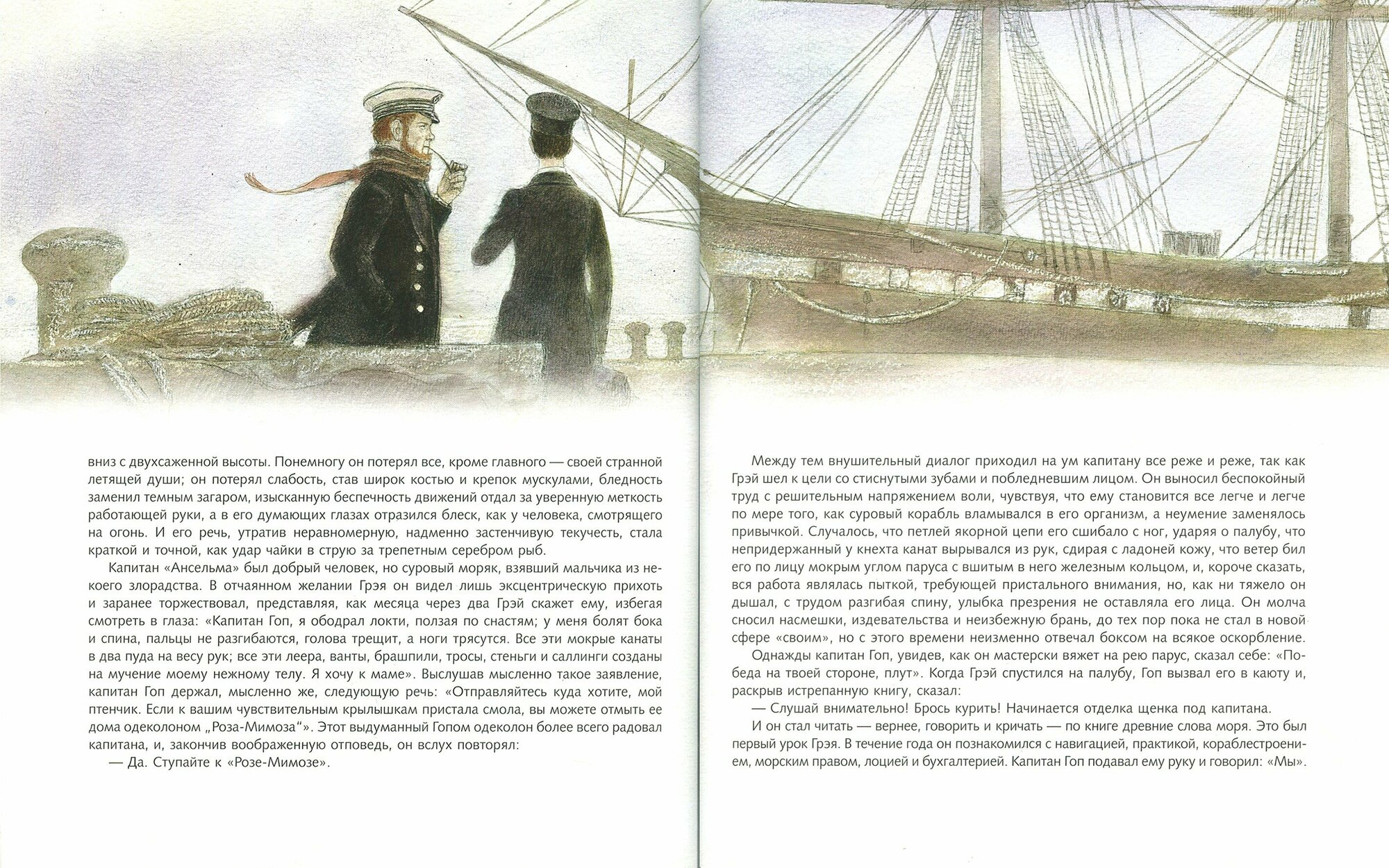 Великолепное издание. Художник-иллюстратор - Андрей Аринушкин. Он создал замечательные пастели, отлично передающие дух произведения, особое очарование приморского городка, нелёгкой жизни моряков. Его Ассоль просто захватывает дух, море, созданное им, такое настоящее, что кажется, что на губах возникает чуть солоноватый привкус. Иллюстрации абсолютно на каждой странице, только где-то это просто морские пейзажи, а где-то герои произведения. Сын ещё очень мал для произведения, ему нет ещё годика, книгу я покупала "на вырост", для заполнения пробелов в нашей детской библиотеке.. Но я уверена, что именно после такого издания у современного мальчишки, живущего в мире гаджетов, возникнет тяга к морю и приключениям, полным отваги и доблести и любви.