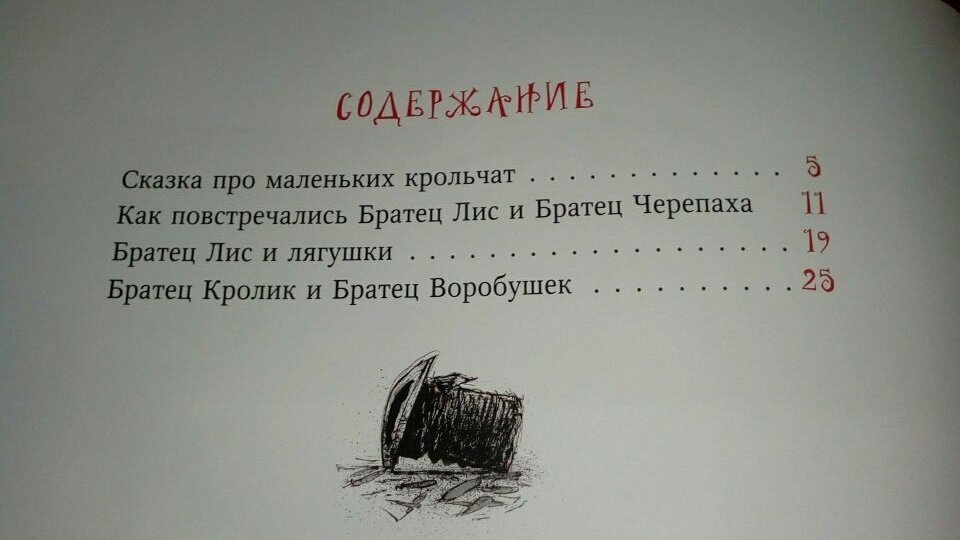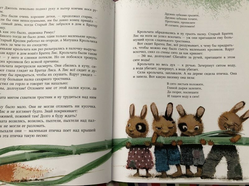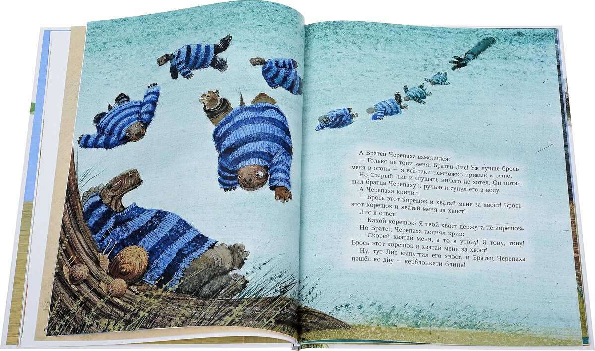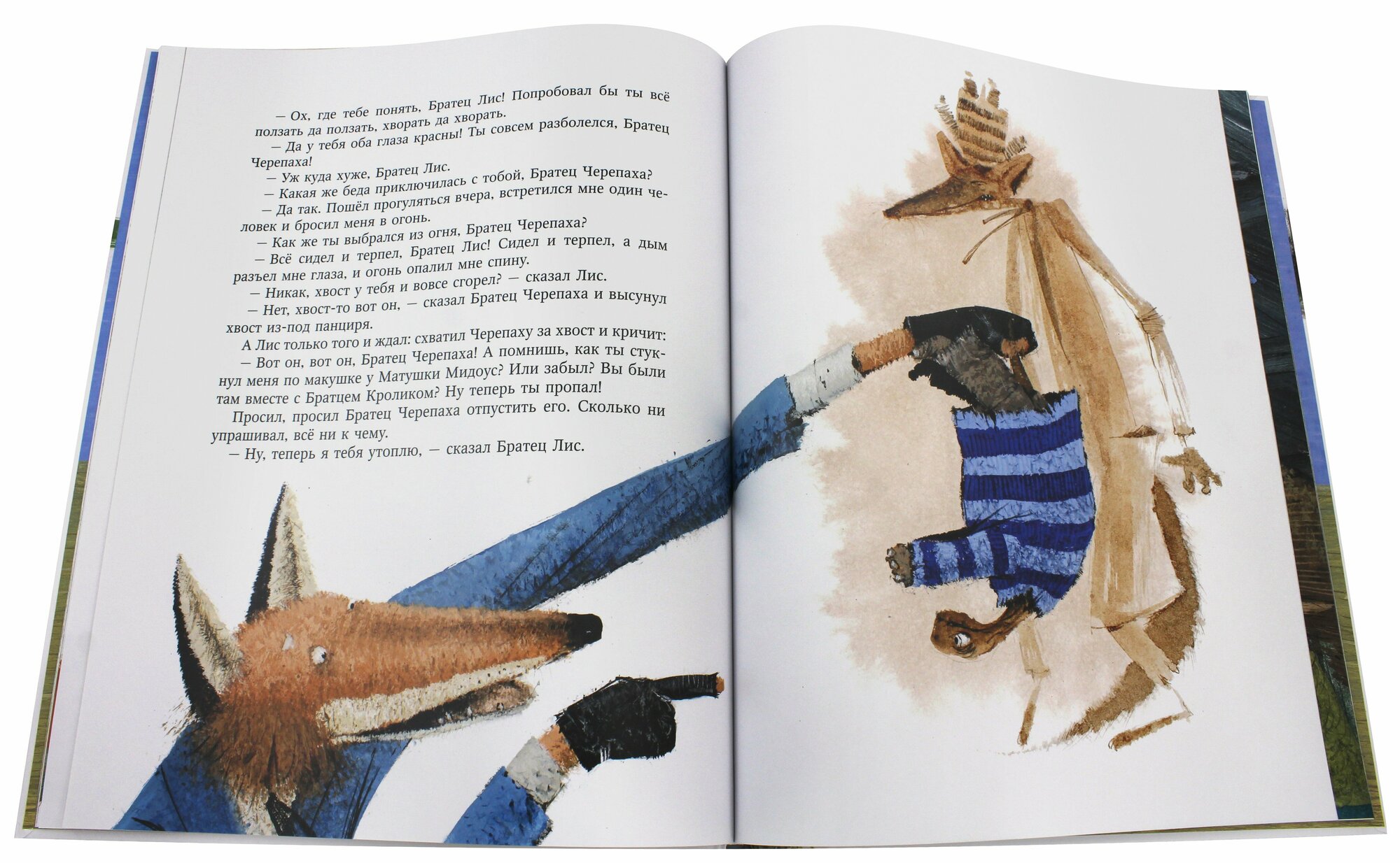 Книга большого формата.Больше,чем А4.Не толстая,для чтеНия лёжа перед сном-удобна.Книга содержит 4 сказки:Сказка про маленьких крольчат,Как встретились братец лис и братец черепаха,Братец лис и лягушки,Братец Кролик и братец Воробушек.Иллюстрации прекрасные!Добрые,в меру яркие и крупные.Не перегружены.Пахнет книга приятно.Страницы книги как у каталогов,толстые и гладкие.Шрифт текста крупный.Такой экземпляр приятно иметь в домашней библиотеке.Даже в подарок можно приобрести.Но сюжеты сказок на «подумать».Деткам постарше подойдёт,для 4 лет тяжеловато восприятие текста и додумок.Дочка часто отвлекается и прочитав одну сказку,просит другую книжку почитать.