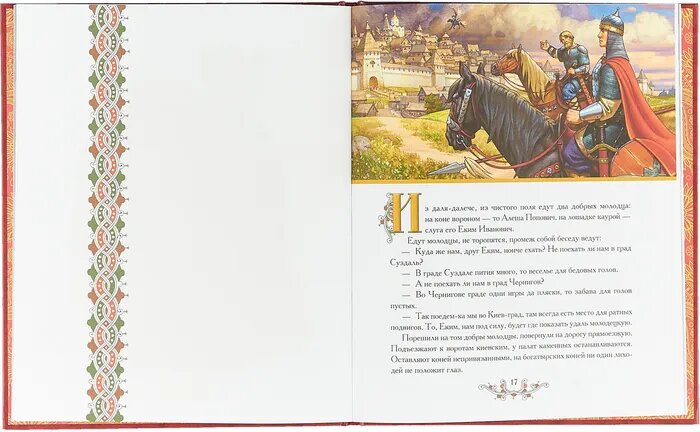 Замечательная книга издательства Акварель содержит три истории о русском богатыре Алёше Поповиче. Насыщена яркими иллюстрациями. Предназначена для чтения взрослыми детям,т.к текст требует разъяснения взрослых(много старорусских слов и выражений).В конце книги имеется словарь. Спасибо издательству за такую яркую серию "русские богатыри". Мой сын с удовольствием слушал истории и рассматривал шикарные иллюстрации,задавал много вопросов. Наши дети должны знать историю наших предков!!!