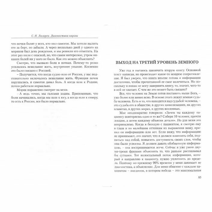 Эта книга, как и другие из серии "Диагностика кармы", очень важная ступенька в познании окружающего мира и развитии личности. Лазарев - не теоретик, он практик, и пишет именно о практической составляющей работы человека над собой для улучшения своего характера и судьбы. Читать Лазарева интересно, он излагает свой путь и пытается через себя и свой опыт помочь многим людям стать счастливее.
