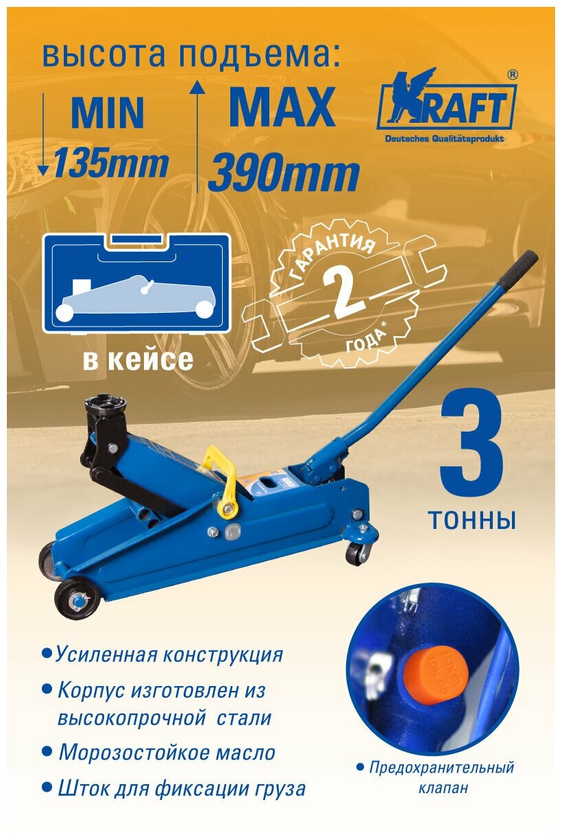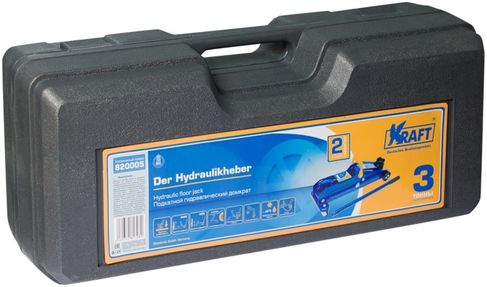 Домкрат KRAFT гидравлический подкатной имеет максимальную грузоподъемность 3т, высоту подъема 390мм, высоту подхвата 135мм, низкий подхват, 1 уровень подхвата.