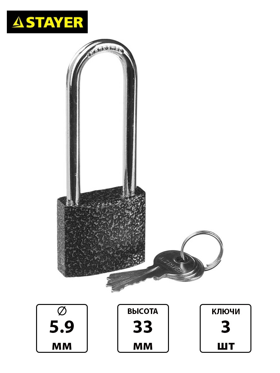 | Прочие особенности и свойства | Надежный замок стандартной серии с усиленным металлическим корпусом и закаленной дужкой. Навесные замки торговой марки STAYER изготовлены из высококачественных материалов и комплектующих, надежны и универсальны в применении. • Усиленный металлический корпус из качественной стали. • Специальное покрытие корпуса обеспечивает защиту замка от воздействий окружающей среды. |